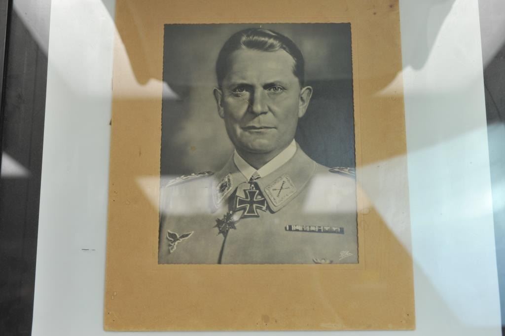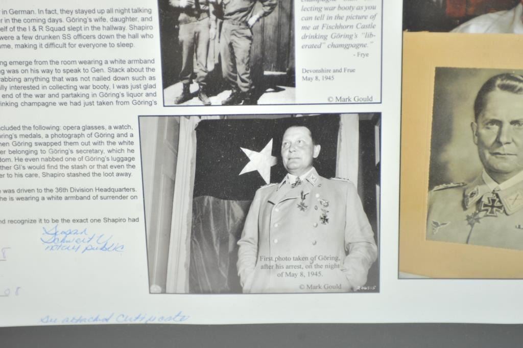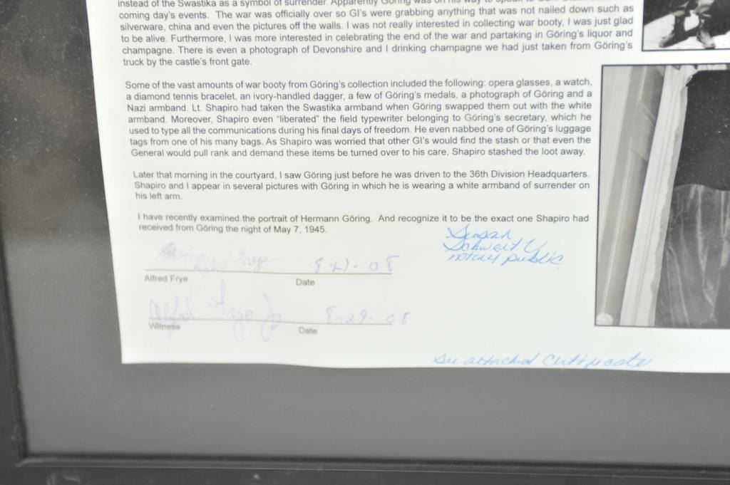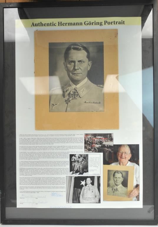 Original Portrait Photo of Herman Goring by Rohn. 11x9 image only. with affidavit signed by Alfred Frye Private in Lt. Jerome Shapiro's Company who captured Goring. He states that Shapiro received this photo May7, 1945 from Goring personally. Nicely framed, good condition. Some normal aging on photo and mat. Est:$400-800