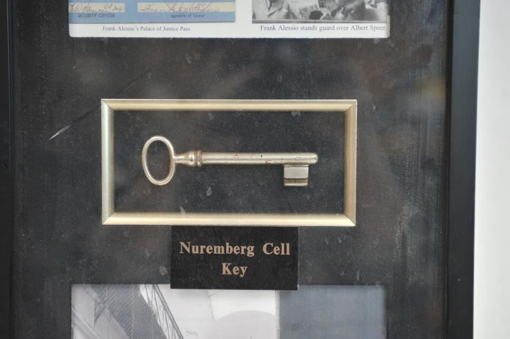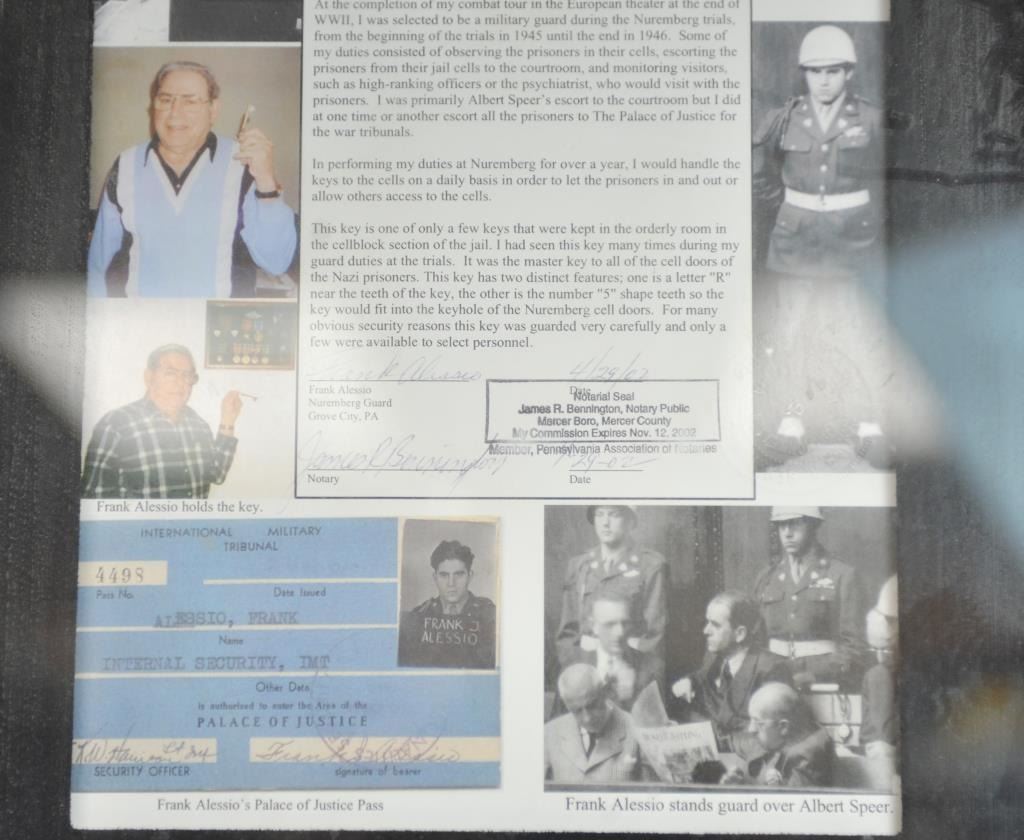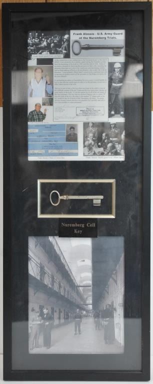 Nuremberg cell key with affidavit signed by Frank Alleso and notarized Nov. 12, 2002 stating he obtained this key when a Military guard at the Nuremberg War Crimes trial. It was one of a few master keys that would openany cell at the Palace of Justice. In Museum display from the Museum of World Wars, Ron Lane Collection. Est:$300-600