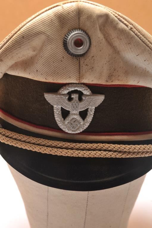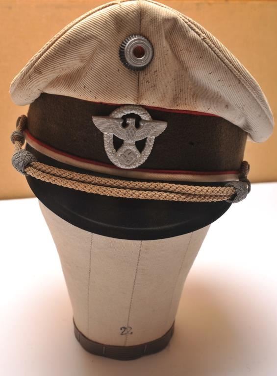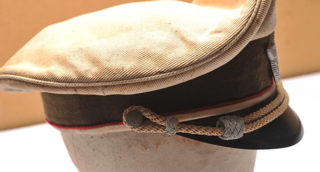 Nazi Era Cap with white on brown body and red piping (Coastal Artillery?) Name Ulrich and partial visible label. Sweat band period replaced Some staining but good overall. Est:$250-500
