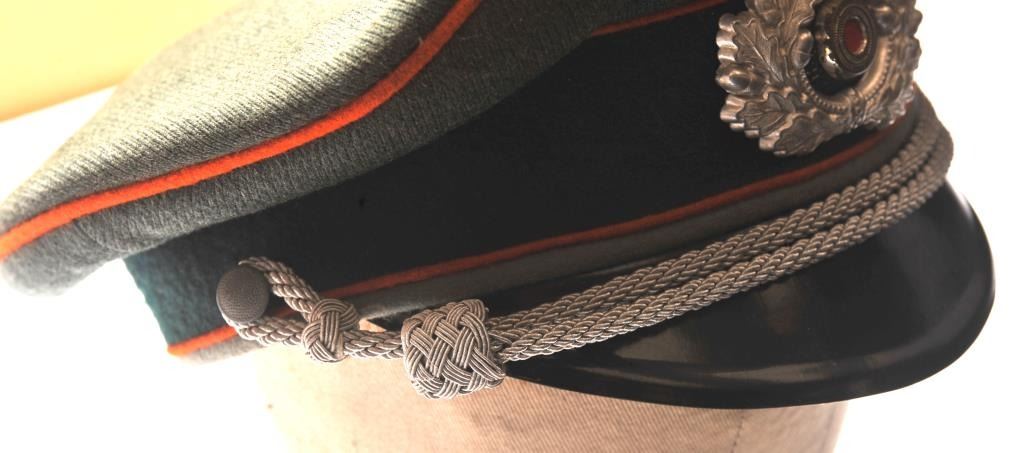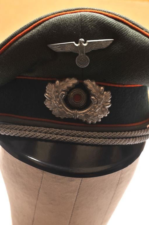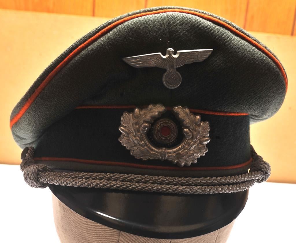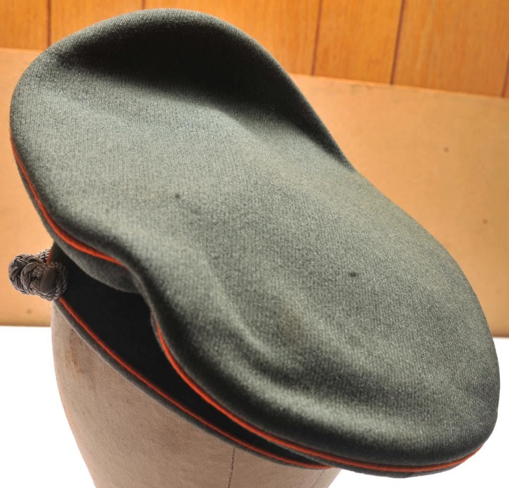 German Wehrmacht Officer's Cap with light and dark green body with orange piping. Name P.W. Spiet on tag inside. Near fine with minor normal aging. Est:$350-700