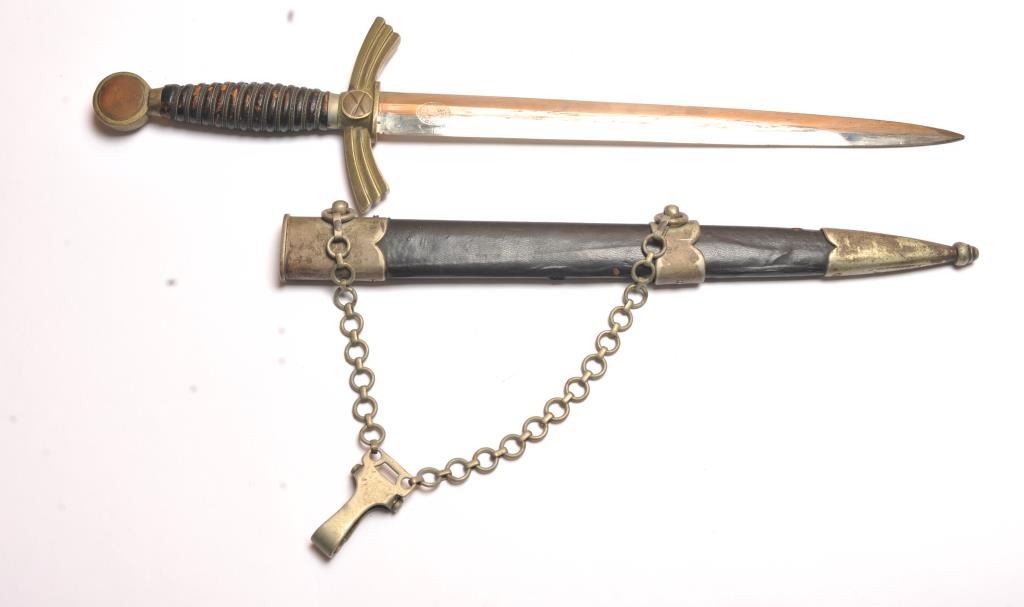 Nazi Era German 1st Model Luftwaffe Dagger with scabbard and hanger. blade is marked Paul Weyersburg Solingen in excellent condition. Nazi emblems defaced. Exterior is good to very good. Est:$250-500