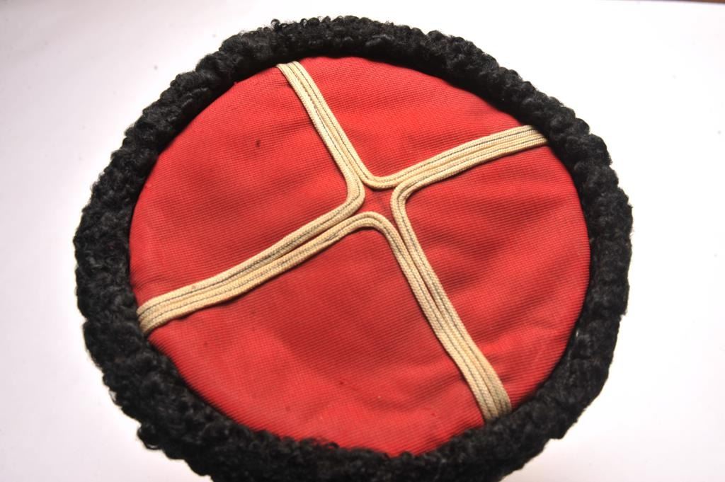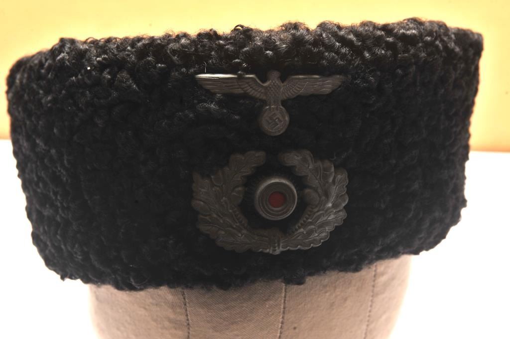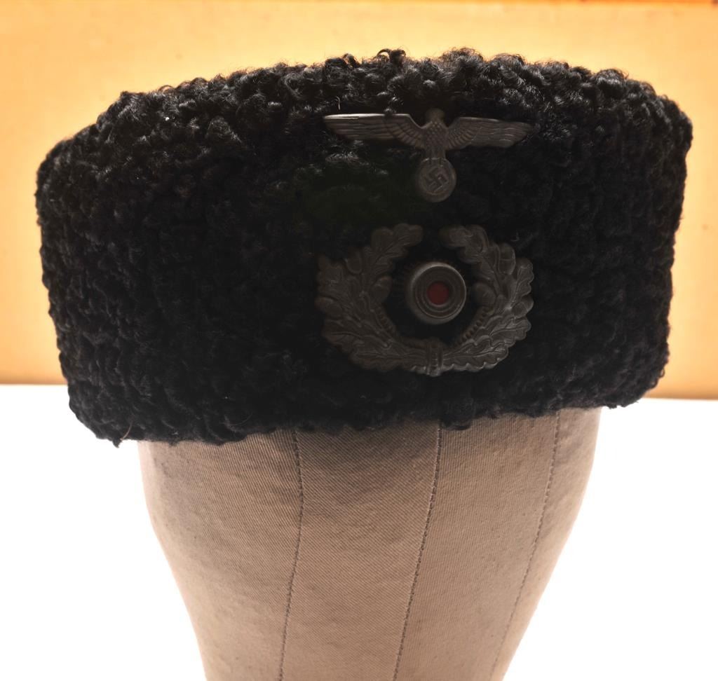 Eastern European Cold Weather Cap of Cossack style with Nazi insignia. Shows age (not authenticated). Ron Lane Collection, Museum of World Wars. As Is. Est:$150-300
