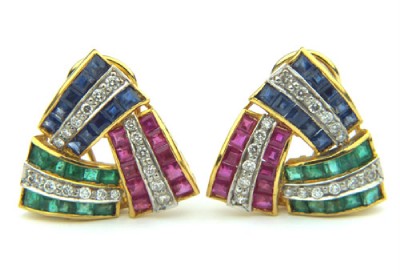 21K Yellow Gold,Emerald,Ruby,Sapphire, Diamond Earrings