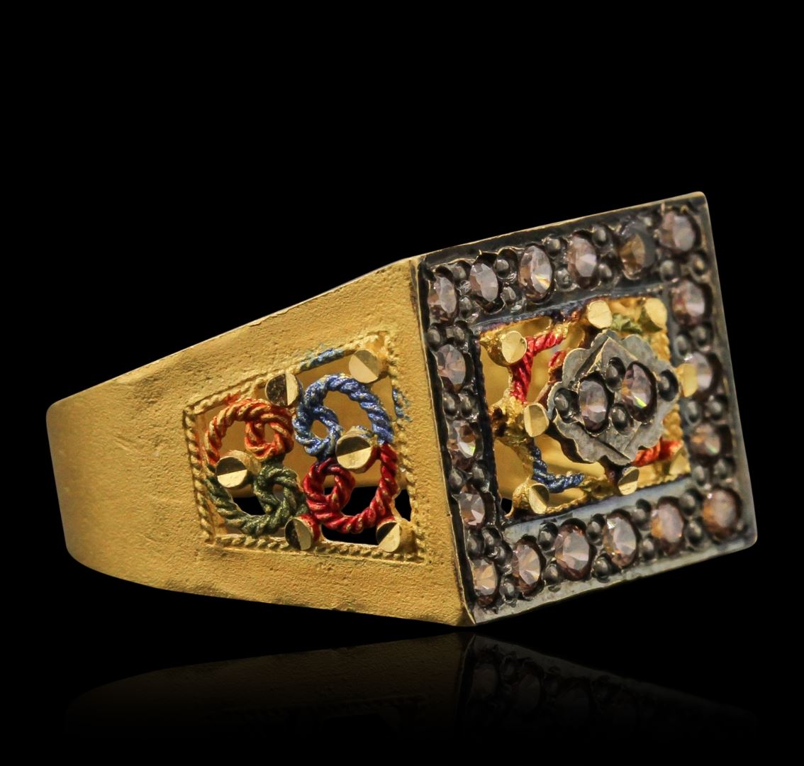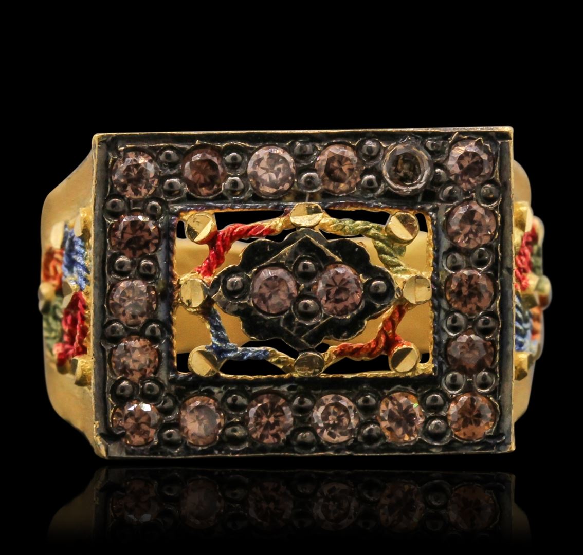 One band featuring: 21KT Yellow Gold, and Pave Set Round Pink Diamonds. Item weighs 6.80 grams.