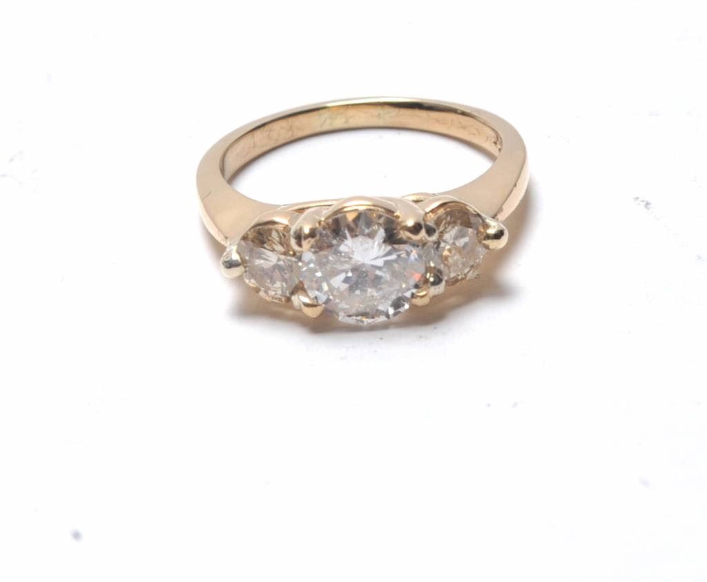 One fine 3 diamond ladies ring containing 1.51ct color I and SI clarity in the center and 2 side diamonds weighing approx 0.60 ct , made in 14 k yellow gold Est:$3500-7000