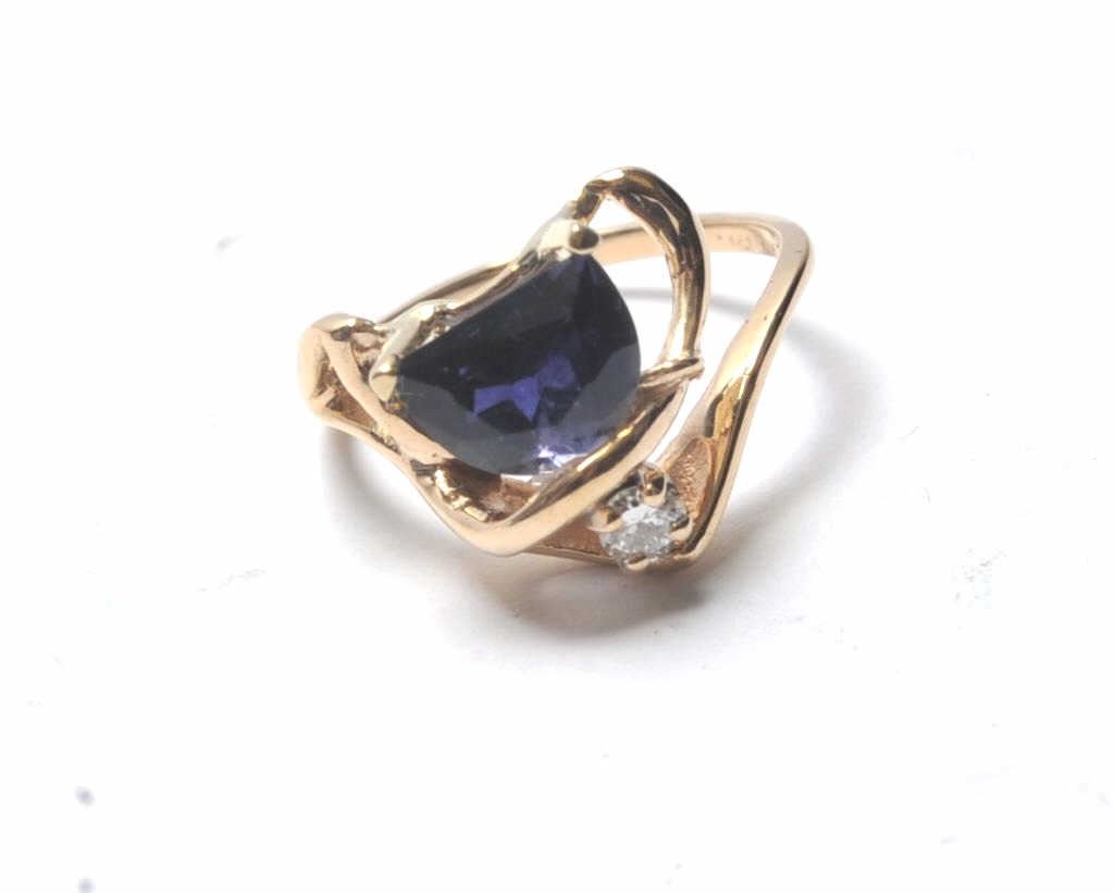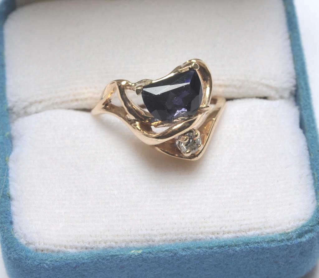 One contemporary ring set with a fine moon shaped faceted blue sapphire approx. 3 ct and a diamond in 14k yellow gold Est:$600-1200