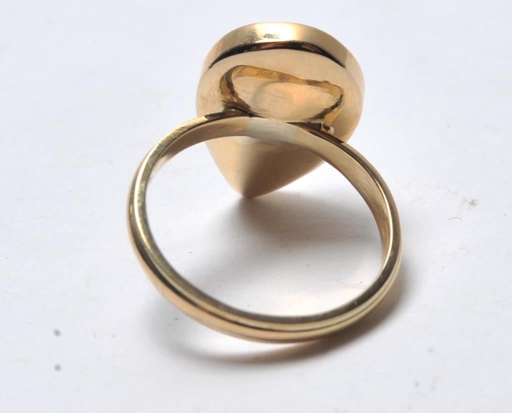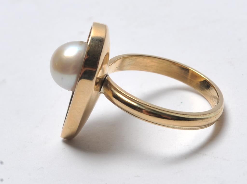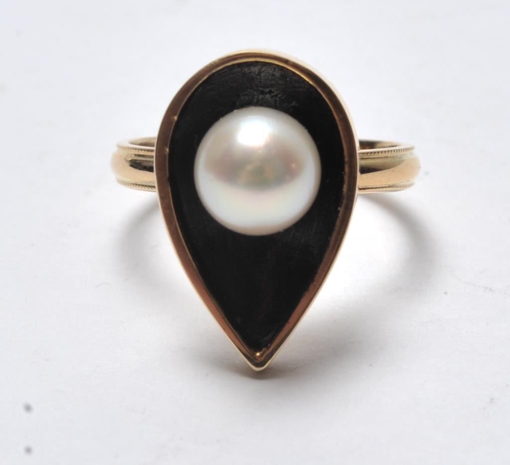 One pear shaped ladies ring set with a fine 8mm akoya pearl in a oxidized backing Est:$325-650