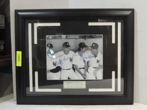 21X17 FRAMED BASEBALL PHOTO 4 AUTOGRAPH: WHITEY FORD, MICKEY MANTLE, BILLY MARTIN AND JOE DIMAGGIO. INCLUDES COA FROM MYST-O-GRAPH #G064471. AS SHOWN. VIEW PICTURE FOR DETAIL.