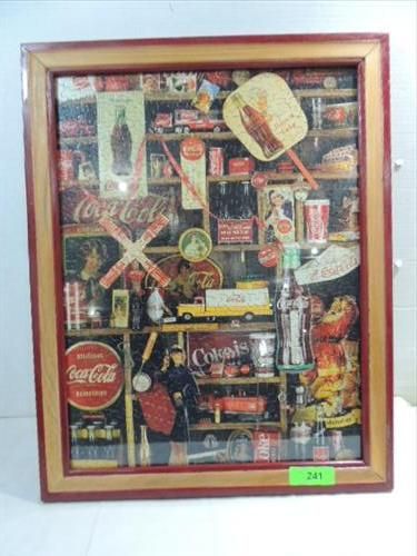 21X26 FRAMED INTERLOCKING PUZZLE OF COCA-COLA COLLECTIBLES. AS SHOWN. VIEW PICTURE FOR DETAIL.