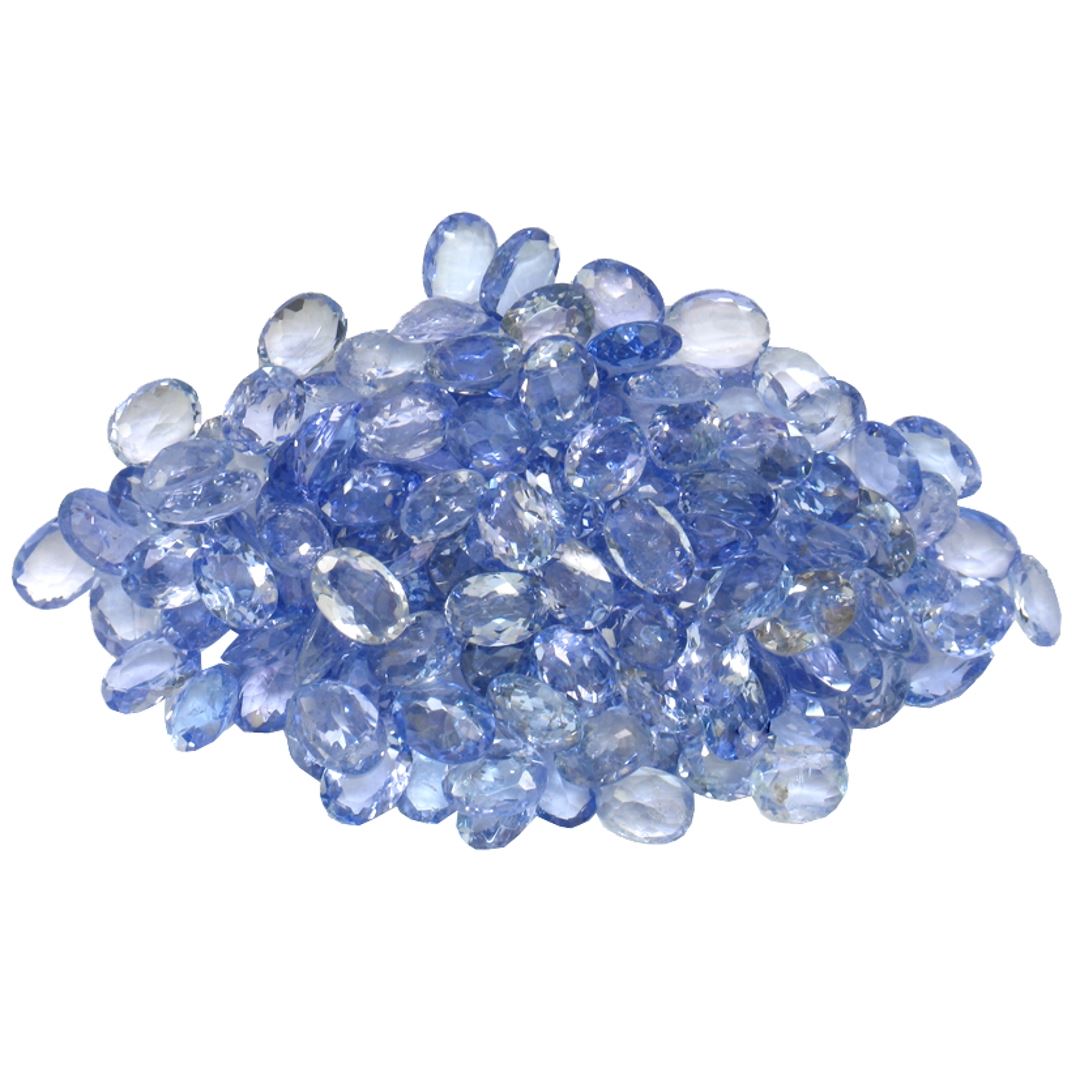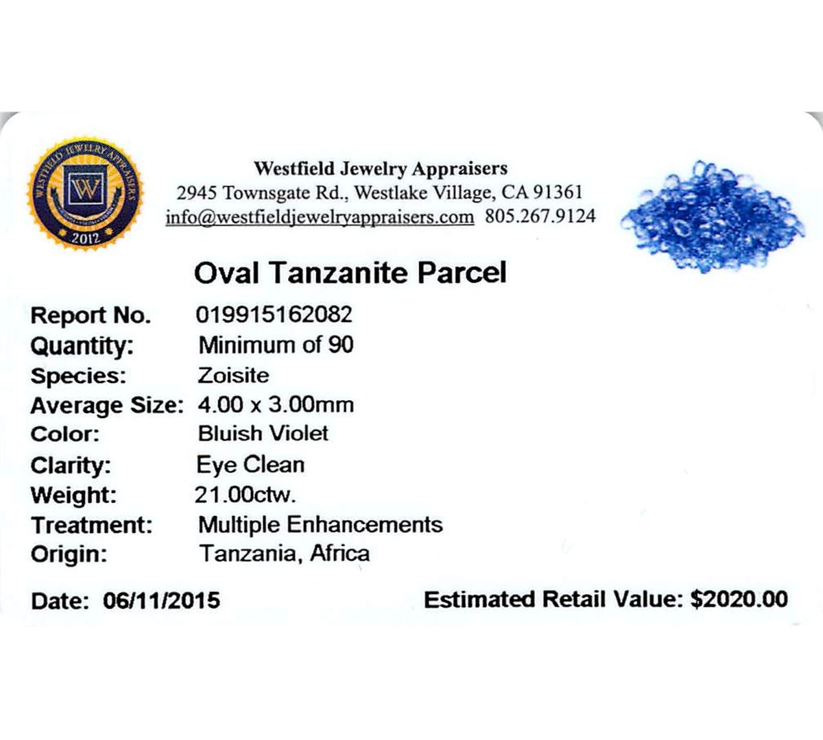 Ninety oval mixed cut natural tanzanites, measuring 4.00 x 3.00 x 1.95mm, exact total weight 21.00ct., clarity is eye clean, type I, medium dark, very slightly grayish, bluish violet color, (GIA bV 6/3), cut is good. Transmitting light with no distortion, transparent. Color grade is an average for the group. Graded in the setting. Tanzanite is a very rare gemstone that is only found in the country of Tanzania. Originally discovered in 1967. Tiffany & Company, named the stone Tanzanite. It is found in the Usumburu Mountains that border the Umba Valley of northern Tanzania. Tanzanite occurs in gray, brown, violet, blue, reddish-purple, & green. The gem is interesting because of its exceptional pleochroism. Rotated in different directions a tanzanite will exhibit multiple changes of color. Tanzanite has a low tolerance to ultrasonic cleaning, and should not be cleaned using this method. Westfield Appraised at $2,020.00.