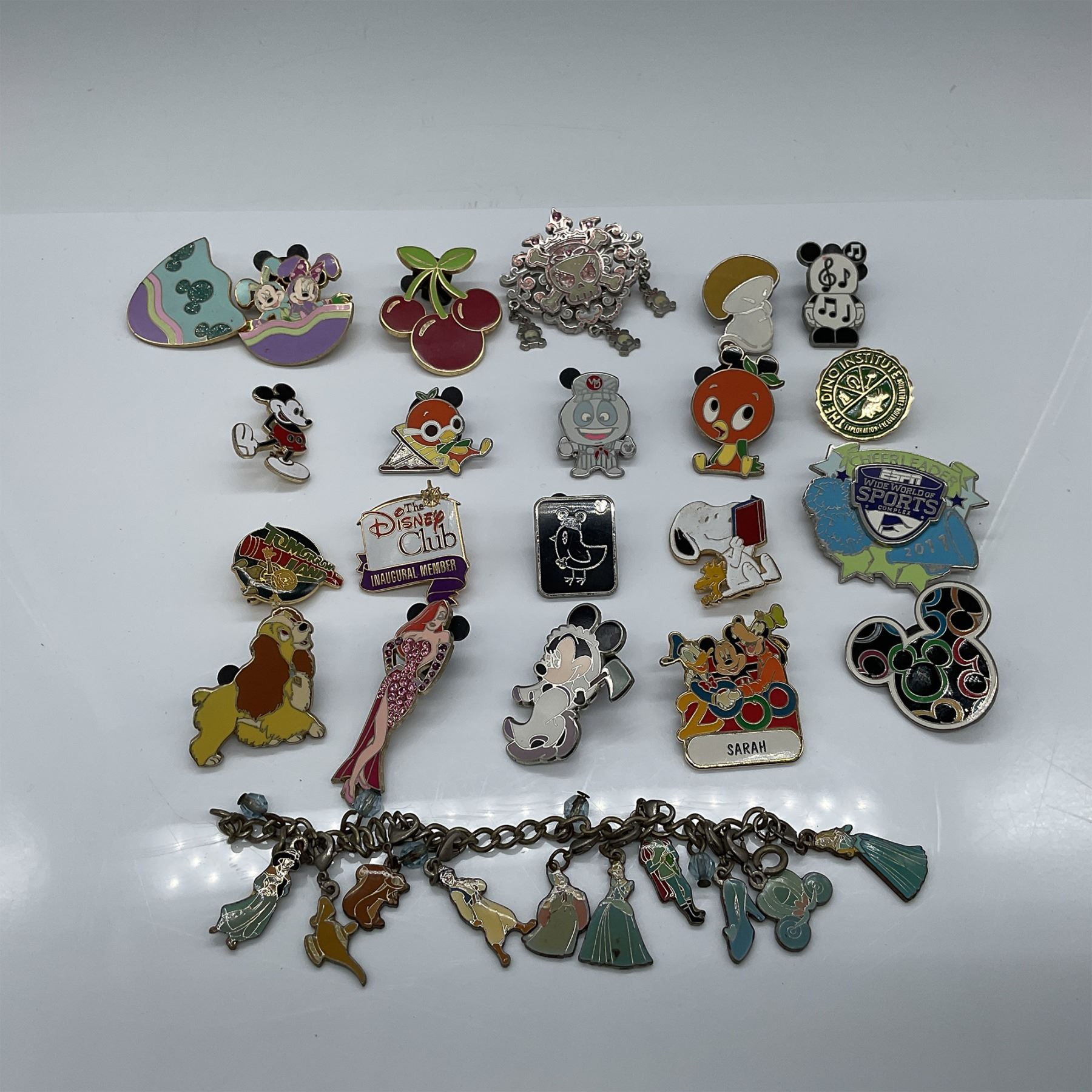 A 21-piece collection of Disney-themed pins and a charm bracelet. The lot includes a variety of enamel pins featuring beloved Disney characters, such as Mickey Mouse, Snoopy, Lady and the Tramp, and others. The vintage charm bracelet showcases detailed Disney character charms, adding a nostalgic touch to the set. The largest piece in the collection measures 2"H. A delightful assortment for Disney enthusiasts and collectors alike.