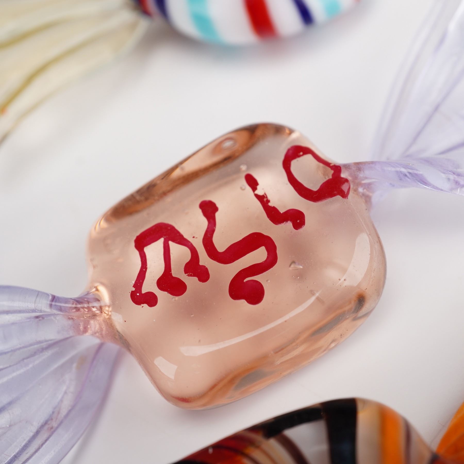 A colorful assortment of hand-blown glass candies, each shaped to resemble wrapped sweets in an array of patterns and hues. The collection includes striped, swirled, and speckled designs in clear, opaque, and translucent glass. Some feature twisted ends, while others incorporate embedded motifs or surface textures.