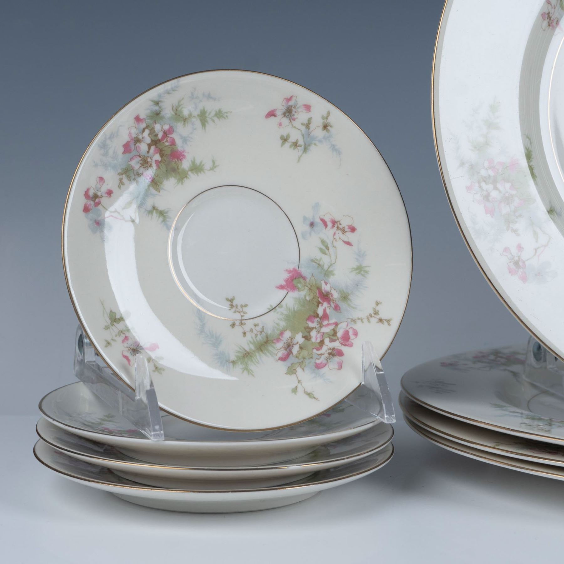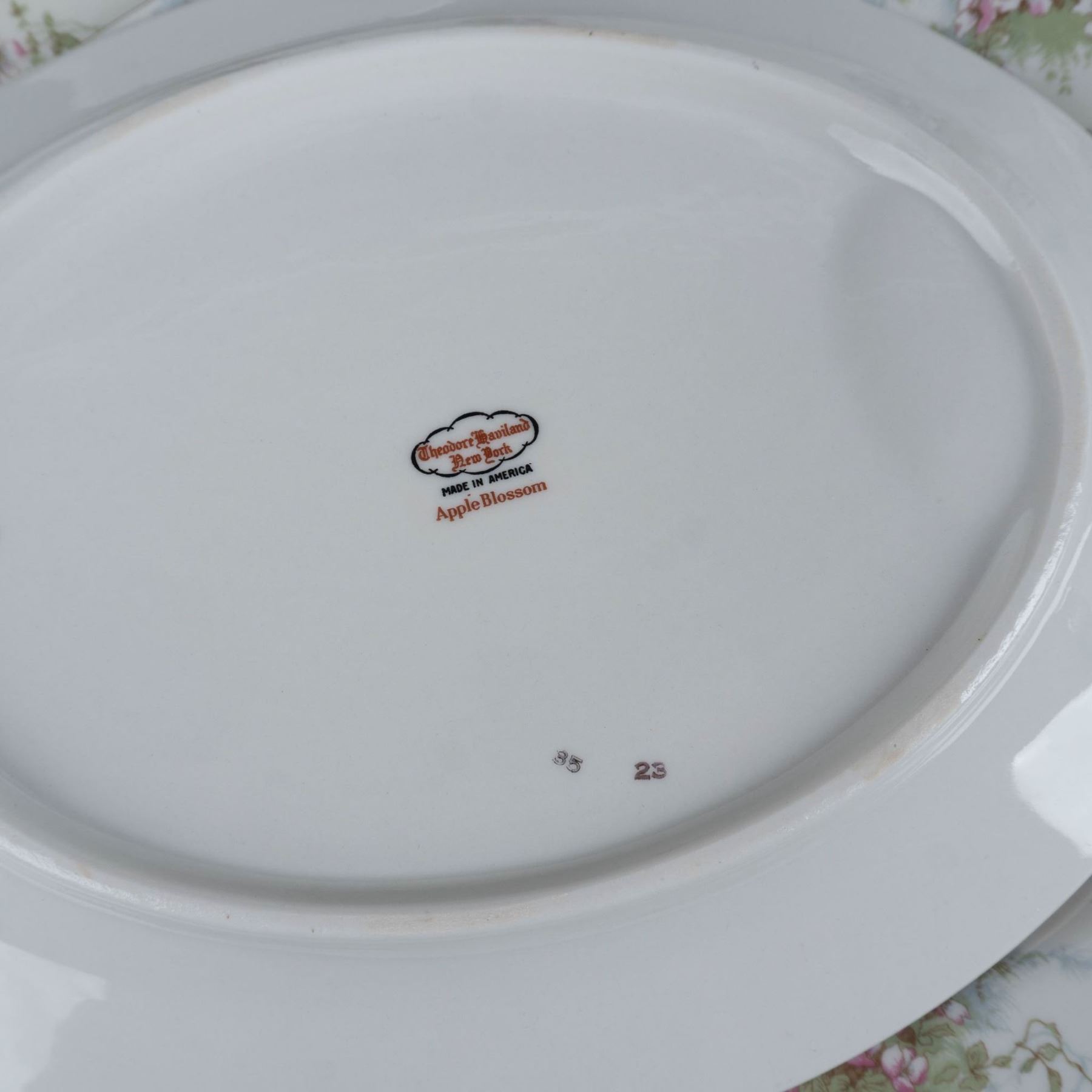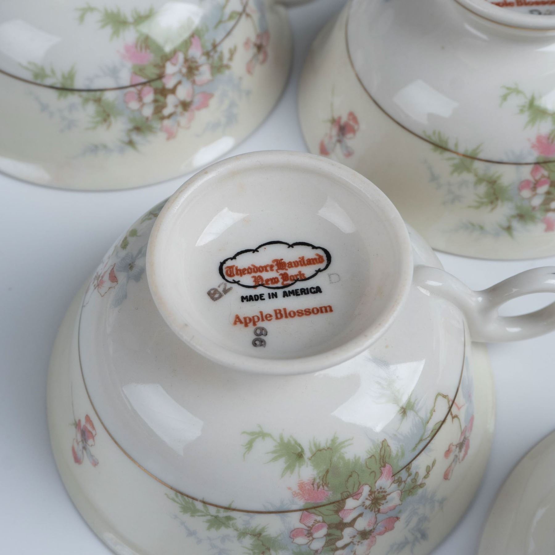 This beautiful set is crafted in the Apple Blossom pattern, featuring delicate pink-tinted apple blossoms nestled among green foliage against an ivory-colored background, all accented with gold gilt trim. The set includes 4 cups with saucers, 4 dessert or salad plates (7.5" dia.), 4 dinner plates (10.25" dia.), two oval vegetable serving bowls, and 3 oval platters (11.75"L, 14"L, and 16.5"L). Theodore Haviland New York backstamp.