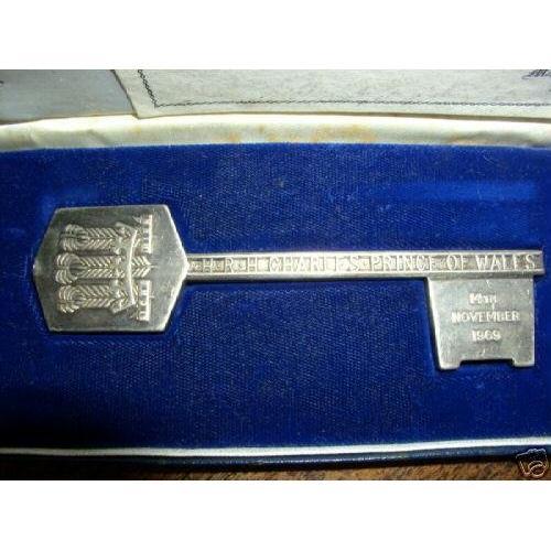 THIS IS A PRINCE CHARLES COMMEMORATIVE MEDALLION KEY WHICH WAS PRESENTED TO HIM ON HIS 21st BIRTHDAY, IT IS MADE OF STERLING AND WEIGHS 3.8 OZS. IT IS 5" LONG. IT COMES IN ITS OWN BLUE VELVET LINED CASE. CERTIFIED BY THE MAYFAIR COIN COMPANY, LONDON,W.I. IT IS #459 FROM A LIMITED EDITION OF 1000.IT WAS TO HIM ON NOV. 14,1969. THE TOP OF THE KEY HAS THE SILVER STAMPS ON IT. THE LION IS PRESENT, AN ANCHOR WHICH MEANS THAT IT WAS MADE IN BIRMINGHAM, THE MAKERS MARK T & S, THE SMALL LETTER "u". THE SHANK OF THE KEY HAS RAISED LETTERS: H.H.H. CHARLES - PRINCE OF WALES. IN VERY FINE CONDITION.
