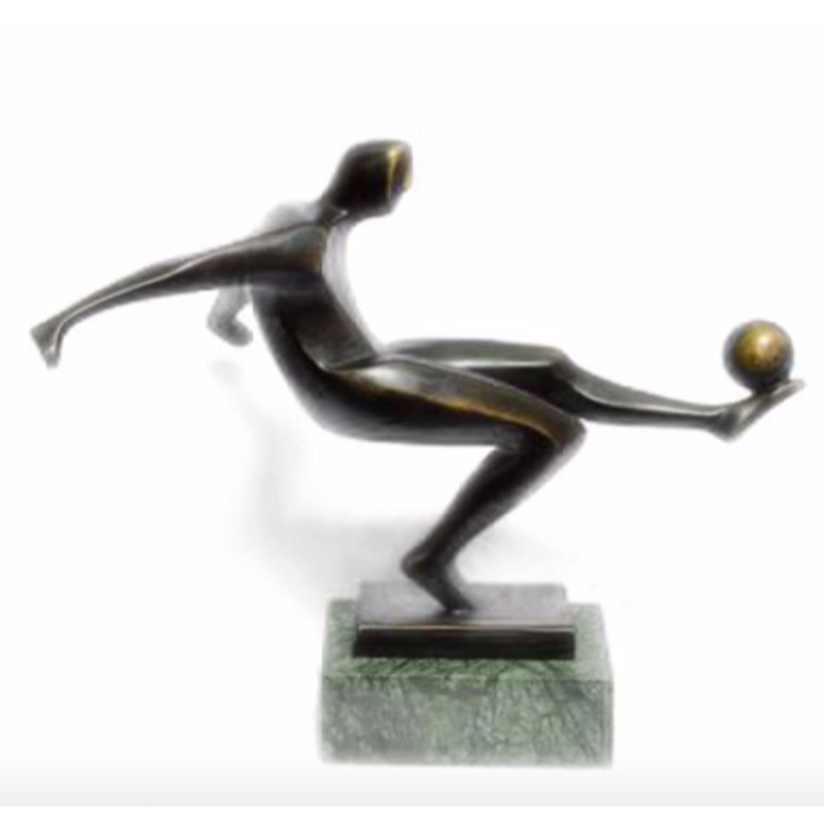 21st Century signed sculpture, modernist, minimalist. Soccer, football player. Lost wax casting method bronze, with dark brown patina, mounted on a green marble base. Signed Mario Nick. 8" H X 8" W. 4lbs.