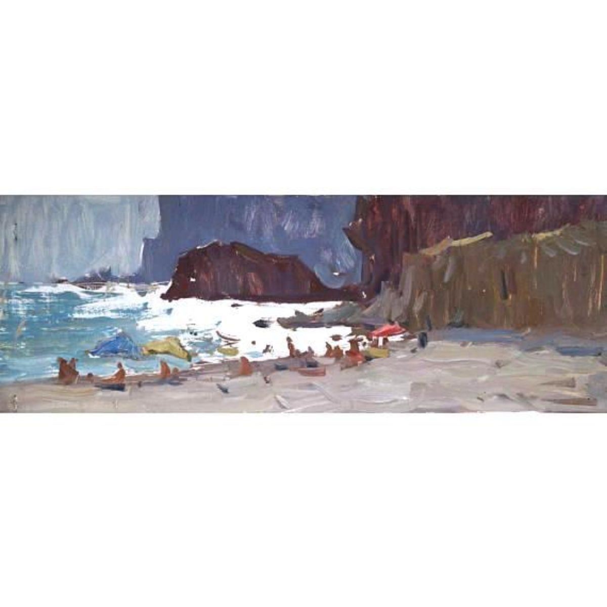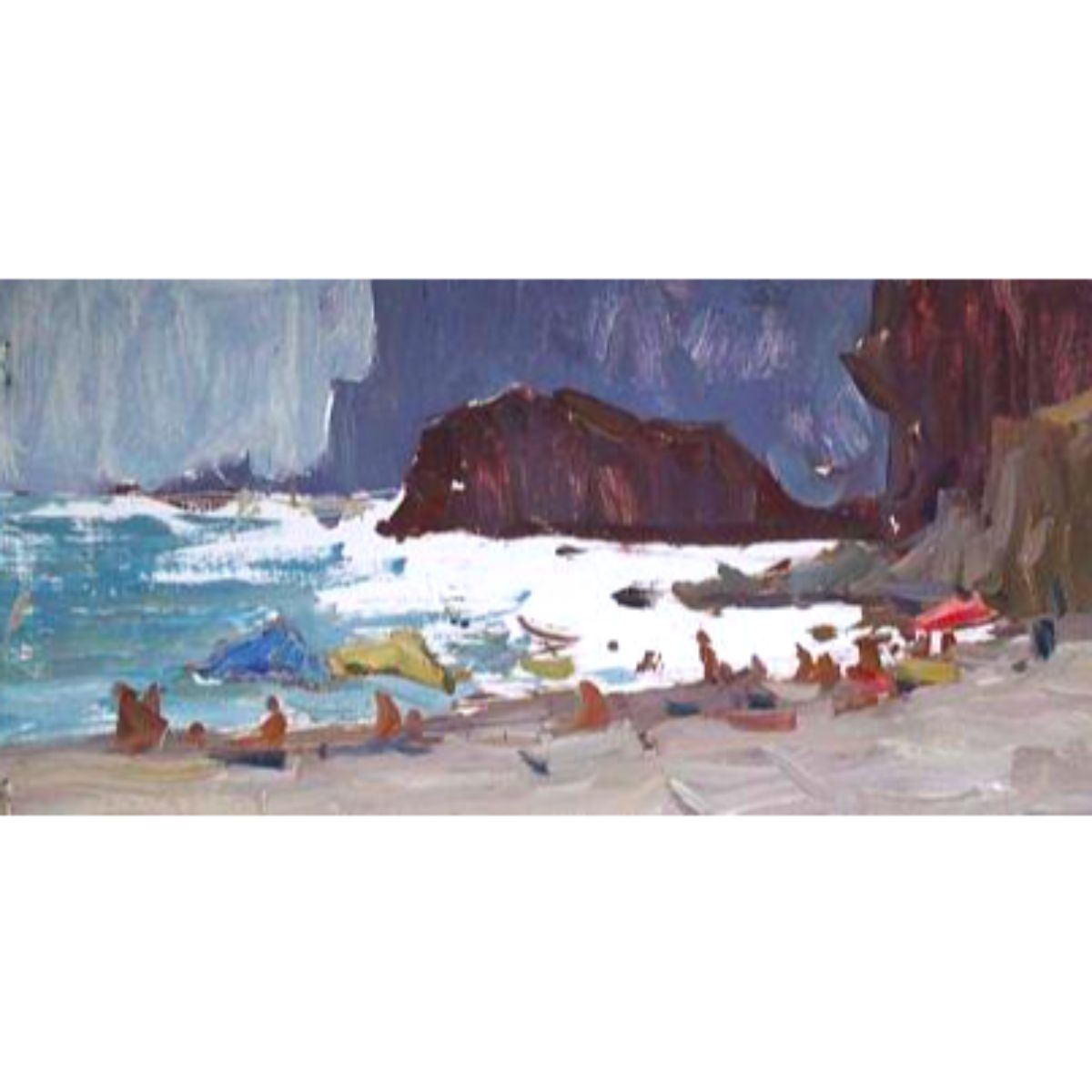 Anna Gusarova ( Ukrainian ) palette knife oil on board painting depicting a rocky coastal landscape, "The Breeze Feelings".  Signed on the reverse & dated 2013. 6 1/2" X  17 1/2". - 9849-031918-ES-90005