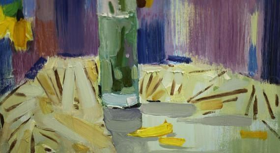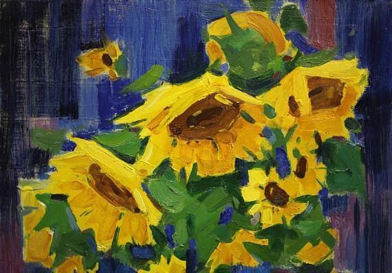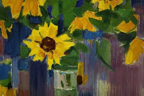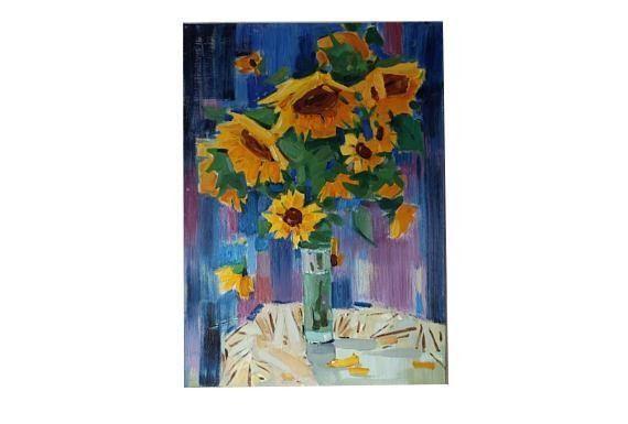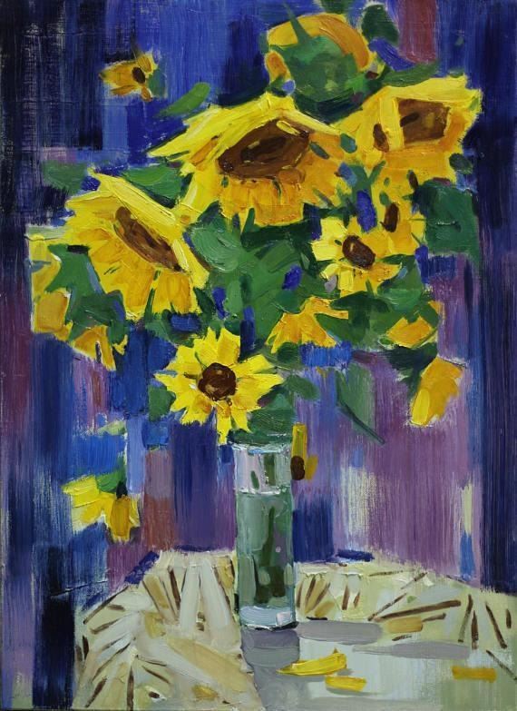 Anna Gusarova (Â 21st Century - 2017 - Ukranian ) Still Life. "Evening Sunflowers" depicting a modern vase of sunflowers sitting on a table. Oil on stretched canvas original, signed on reverse. 19 3/4" X 27 1/2". Â 9851-031918-ES-90007