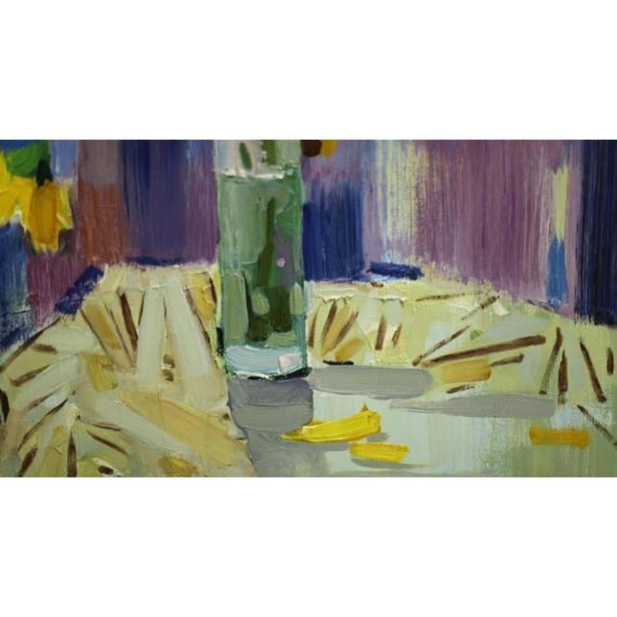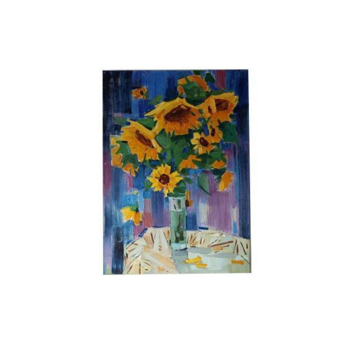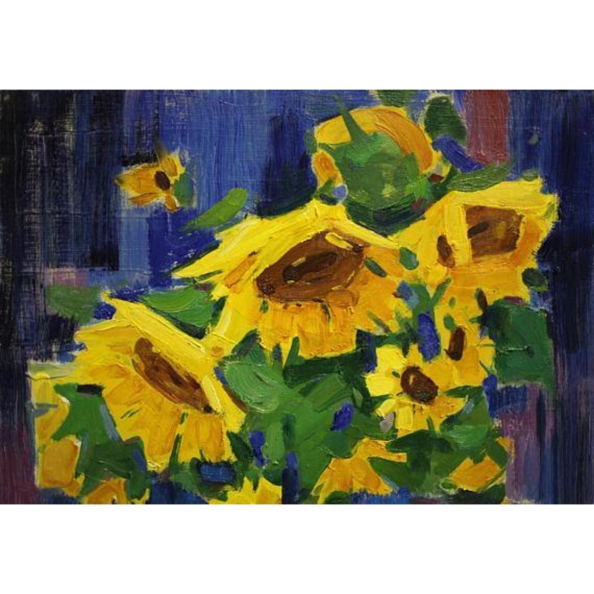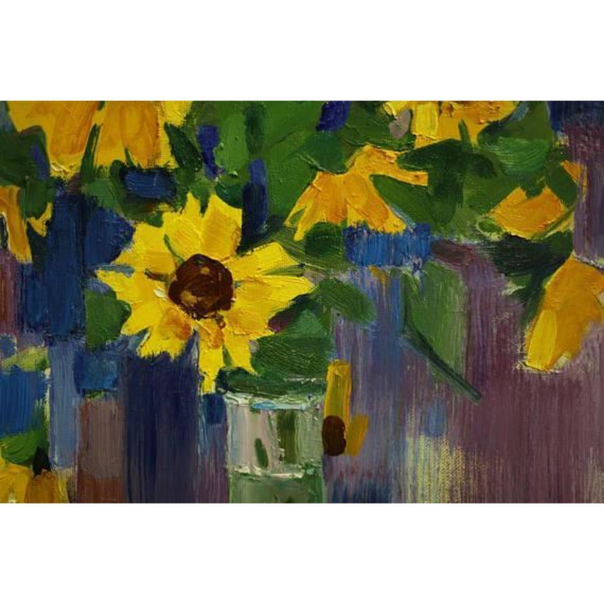 Anna Gusarova (Â 21st Century - 2017 - Ukranian ) Still Life. "Evening Sunflowers" depicting a modern vase of sunflowers sitting on a table. Oil on stretched canvas original, signed on reverse. 19 3/4" X 27 1/2". Â 9851-031918-ES-90007