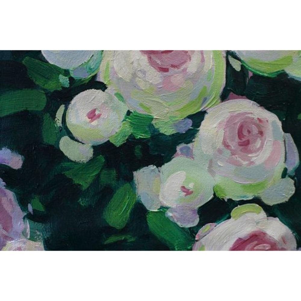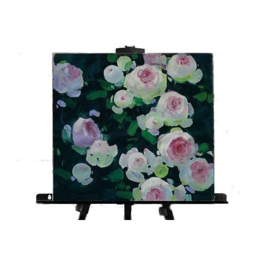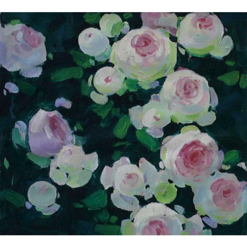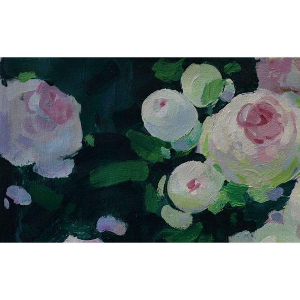 Anna Gusarova ( 21st Century - 2017 - Ukranian Impressionism ) Still Life. "Sunny Roses" depicting pink roses. Oil on unstretched canvas original, signed on reverse. 15" X 16". 9850-031918-ES-89604