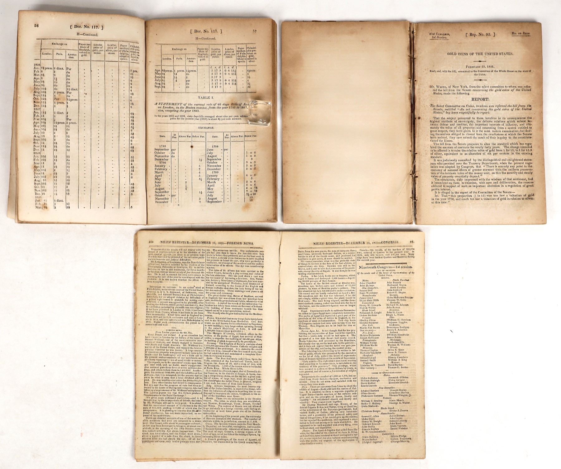 Congressional report dated February 22, 1831 discussing foreign coinage used in the United States (Spanish dollars and five franc coins), and dollars of the new American Government, as legal tender. Second session of the 21st Congress. 118 pages, 5 x 9 inches; no cover, loose binding. Also Niles' Weekly Register dated December 10, 1825, a Baltimore publication discussing the new half dollar. About 16 pages, 5 x 9 inches, no cover.