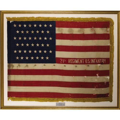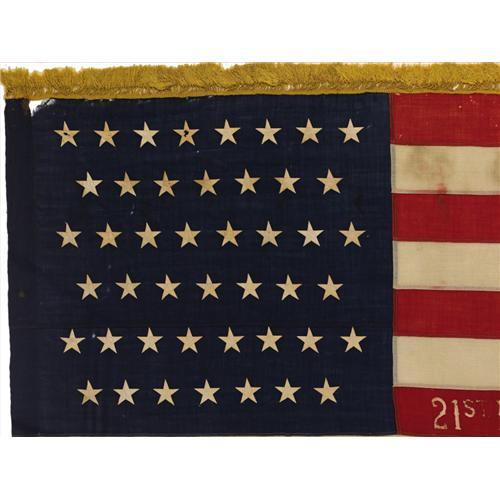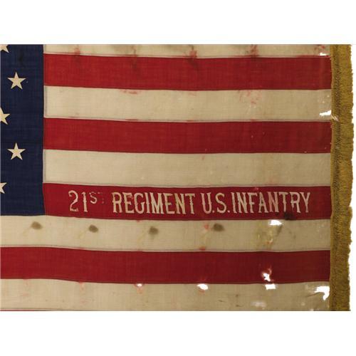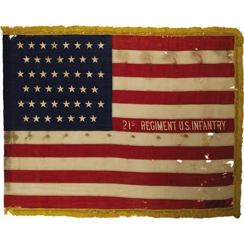 <B> 21st U.S. Infantry Regimental Flag - Hand Painted in Gold Circa 1890s</B></I> A rare Spanish American War regimentally marked flag, with 45 stars, wool bunting, 50” x 68” with gold fringe. The center stripe bears a unit designation painted in gold, “21st REGIMENT U. S. INFANTRY.” Originally formed during the War of 1812 this flag flew over U.S. Forces during the Spanish American War in Cuba at the battle of Santiago (San Juan Hill).<BR><BR><B>Provenance:</B></I> <I>Crow Art Partnership Collection (Dallas, Texas)</B></I><BR><BR><b>Shipping:</b> Requires 3rd Party Shipping (<a target="_blank" href="http://www.heritageauctions.com/common/shipping.php">view shipping information</a>)