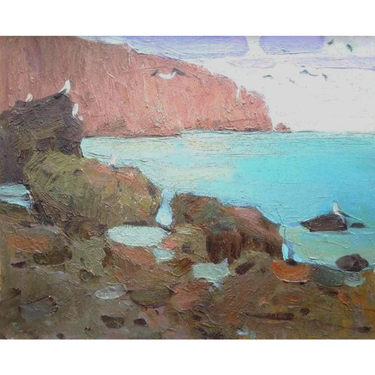 21st Century Impressionism, Sunset Seascape Oil on boardpainting by Ukrainian artist Anna Gusarova. Signed bottom left & dated 2015 on the reverse. 9 1/4" X 12 1/4".