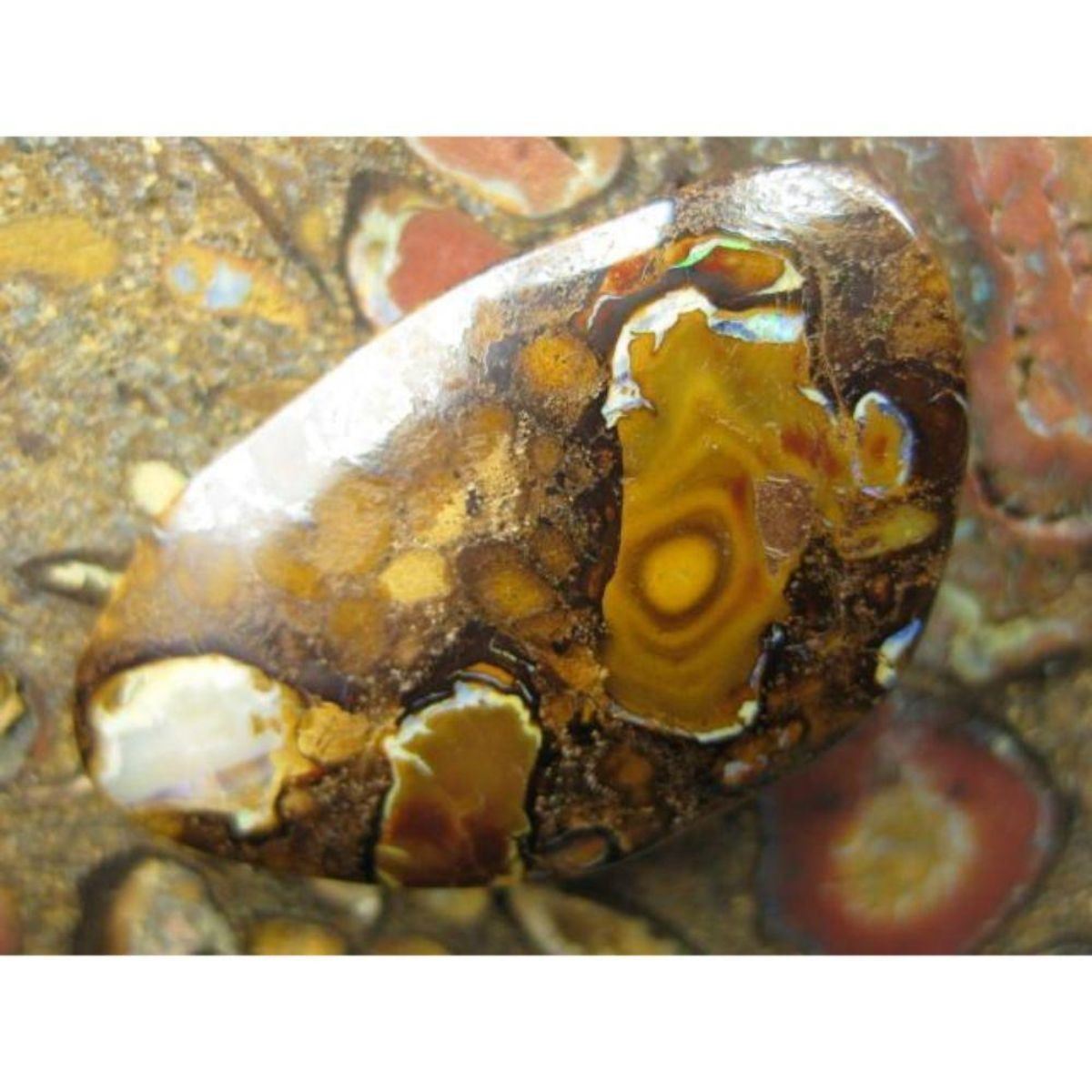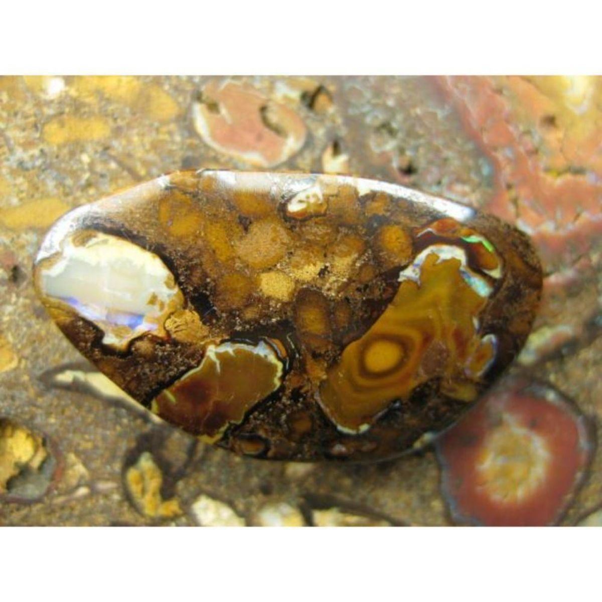 TYPE OF OPAL…...............BOULDER MATRIX/UNTREATED. FIELD/ORIGIN…................YOWAH AUSTRALIA. COLOUR…..........................AS PER IMAGE. PATTERN….........................AS PER IMAGE. NO OF PIECES….........................1. BRIGHTNESS RATING 1 TO 5. =3.9. DESCRIPTION…..........................GREAT PATTERN BOULDER MATRIX OPAL. (opal colour and pattern as per image, the stone you see in pictures is the stone you get.)    -- Additional General Details about Opals to Inform the Knowing Bidder: Opal is a hydrated amorphous form of silica (SiO2·nH2O); its water content may range from 3 to 21% by weight, but is usually between 6 and 10%. Because of its amorphous character, it is classed as a mineraloid, unlike crystalline forms of silica, which are classed as minerals. It is deposited at a relatively low temperature and may occur in the fissures of almost any kind of rock, being most commonly found with limonite, sandstone, rhyolite, marl, and basalt. Opal is the national gemstone of Australia. The internal structure of precious opal makes it diffract light. Depending on the conditions in which it formed, it can take on many colors. Precious opal ranges from clear through white, gray, red, orange, yellow, green, blue, magenta, rose, pink, slate, olive, brown, and black. Of these hues, the black opals are the rarest, whereas white and greens are the most common. Opals vary in optical density from opaque to semi-transparent and show opalescence, a form of iridescence. There are 9 separate factors that contribute to the price of an Opal. These factors are: Color Direction / Play of Color Pattern Body tone Brightness Shape Inclusions Where the Opal was mined Country of Origin At Lightning Ridge, in Australia, a committee values opal miner’s opals each Saturday. Several opal appraiser price each opal by carat with the final value determined by the price per carat. COLOR In order of evaluation value, the most valuable color is a dominant red, then orange, green, blue and purple. Electric blue Opals is the most valuable of the blues. DIRECTION OF COLOR Opals are a gemstone that dramatically change appearance based on the angle of view. When an Opal is at it’s brightest, this is called its ‘facing’/ andle. The direction of color will affect the price because it determines how versatile the Opal is. PATTERN Opals that have a rare or unique pattern are more valuable. The Harlequin patternis the rarest and most loved pattern in opals but it is very rare. A True harlequin pattern is a mosaic broad pattern, angular close set of colors. Floral patterns are sometimes called floral harlequin.Some top patterns are Mackerel, Block, Broad flash, Rolling-flash, Pin-fire, Rainbow and most sought out Ethiopian opal is the Honeycomb pattern. BODY TONE Opals are grouped in 9 sub categories N1 to N9 with N1 the darkest opal and N9 the lightest. Black opals are generally the most valuable and have a body tone of N1 to N4 Opals with N5 to N6 considered a semi black or dark opal. Body tone N7 to N9 are called crystal opals. BRIGHTNESS The Opal brightness guide was produced by the Australian opal association along with the body tone guide. There are 7 sub Brightness ratings with B1 the brightest to B7 the dullest. The brighter the Opal, the more expensive will be its value. SHAPE Oval stone are generally considered more valuable than free form, except with boulder opals where free form is considered desirable. The shape of the Opal once again determines how versatile it is. Oval stones generally have the best face of color and can be used in a variety of applications. Opal is almost always cut in a cabochon. A cabochon stone is more valuable when it has a high. This is due to the fact that cabochons make ideal ring stones. INCLUSIONS Inclusions and potch lines and are not to be confused with cracks. A crack line reflects light and greatly devalues an Opal. A potch line has no light reflection and these opals are generally valued lower but can make artistic picture patterns. Some Opals will have a vegetation pattern from the inclusions and this is popular as the opal has replaced some of the tree or vegetation. Sand or windows also reduce the value of the opal. A window is a gap on the bottom where potch has not formed and opal is transparent. Ethiopian opal can have a ghost or phantom inclusions or vegetation matter. These types of inclusions are generally accepted as reasonable in this type opal. OPAL FIELD SOURCE The end buyer or wholesaler might not be able to consider this factor. But in the trade certain mines have a reputation of producing good quality rough that makes excellent stones. This happens in Australian and Ethiopian opal fields. Even the depth of the mine can greatly effect value. Opal doublets and triplets do not have the same stringent criteria as solid opals and are valued considerable less. It is important to be able to pick a doublet opal compared to a solid and this can be difficult when the opal is set into jewelry. COUNTRY OF ORIGIN Australia has a worldwide reputation as the world’s most expensive opals. Many countries now produce good opals like Ethiopia, Mexico and Brazil. Each country’s opals may be unique and this factor helps determine the Opal price. Regardless of the country of origin, all opals are rare, valuable and unique. Opal Stones rank very high as an appreciating asset.  - #1501-042319-CM-2-467