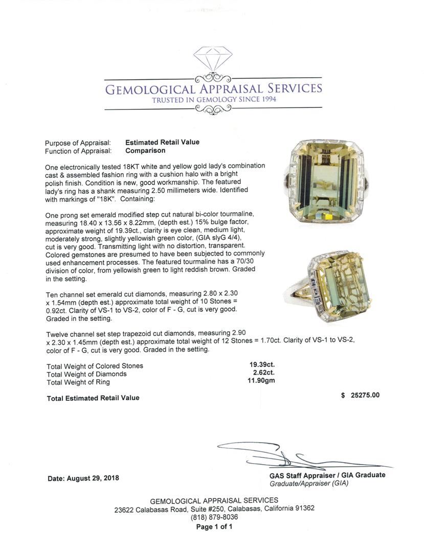 One electronically tested 18KT white and yellow gold lady's combination cast & assembled fashion ring with a cushion halo with a bright polish finish. The featured lady's ring has a shank measuring 2.50 millimeters wide. Identified with markings of '18K'. Condition is new, good workmanship. Containing: One prong set emerald modified step cut natural bi-color tourmaline, measuring 18.40 x 13.56 x 8.22mm, (depth est.) 15%. bulge factor, approximate weight of 19.39ct., clarity is eye clean, medium light, moderately strong, slightly yellowish green color, (GIA slyG 4/4), cut is very good. Transmitting light with no distortion, transparent. Colored gemstones are presumed to have been subjected to commonly used enhancement processes. The featured tourmaline has a 70/30 division of color, from yellowish green to light reddish brown. Graded in the setting. Ten channel set emerald cut diamonds, measuring 2.80 x 2.30 x 1.54mm (depth est.) approximate total weight of 10 Stones = 0.92ct. Graded in the setting. Color F - G Clarity VS-1 to VS-2 Cut Very Good Twelve channel set step trapezoid cut diamonds, measuring 2.90 x 2.30 x 1.45mm (depth est.) approximate total weight of 12 Stones = 1.70ct. Graded in the setting. Color F - G Clarity VS-1 to VS-2 Cut Very Good. Total Weight of Colored Stones 19.39ct.. Total Weight of Diamonds 2.62ct.. Total Weight of Ring 11.90gm GAS Appraised at $25275.00. GAS Appraised at $25,275.00.