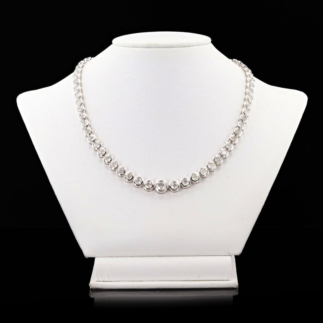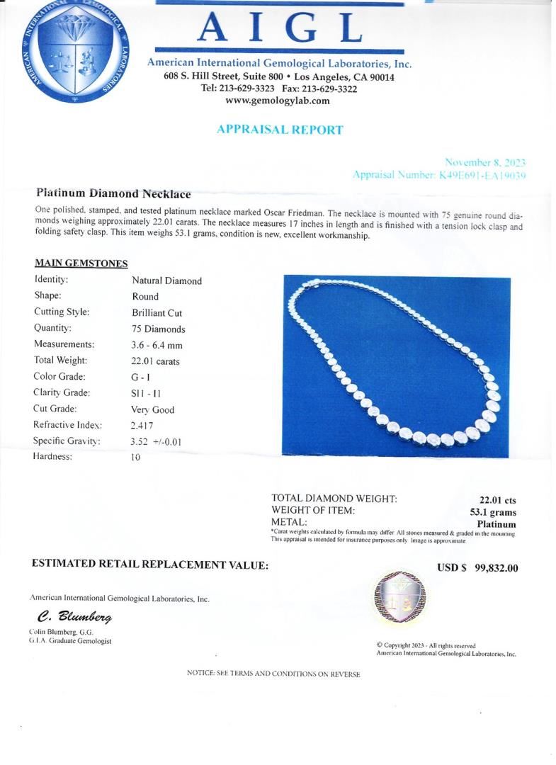One polished. stamped. and tested platinum necklace marked Oscar Friedman. The necklace is mounted with 75 genuine round diamonds weighing approximately 22.01 carats. The necklace measures 17 inches in length and is finished with a tension lock clasp and folding safety clasp. This item weighs 53.1 grams, condition is new. excellent workmanship. #MAIN GEMSTONES# Identity: Natural Diamond Shape: Round Cutting Style: Brilliant Cut Quantity: 75 Diamonds Measurements: 3.6 - 6.4mm Total Weight: 22.01 carats Color Grade: G-I Clarity Grade: SI1-I1 Cut Grade: Very Good Refractive Index: 2.417 Specific Gravity: 3.52 +/-0.01 Hardness: 10 TOTAL DIAMOND WEIGHT: 22.01 cts WEIGHT OF ITEM: 53.1 grams METAL: Platinum Size: 17