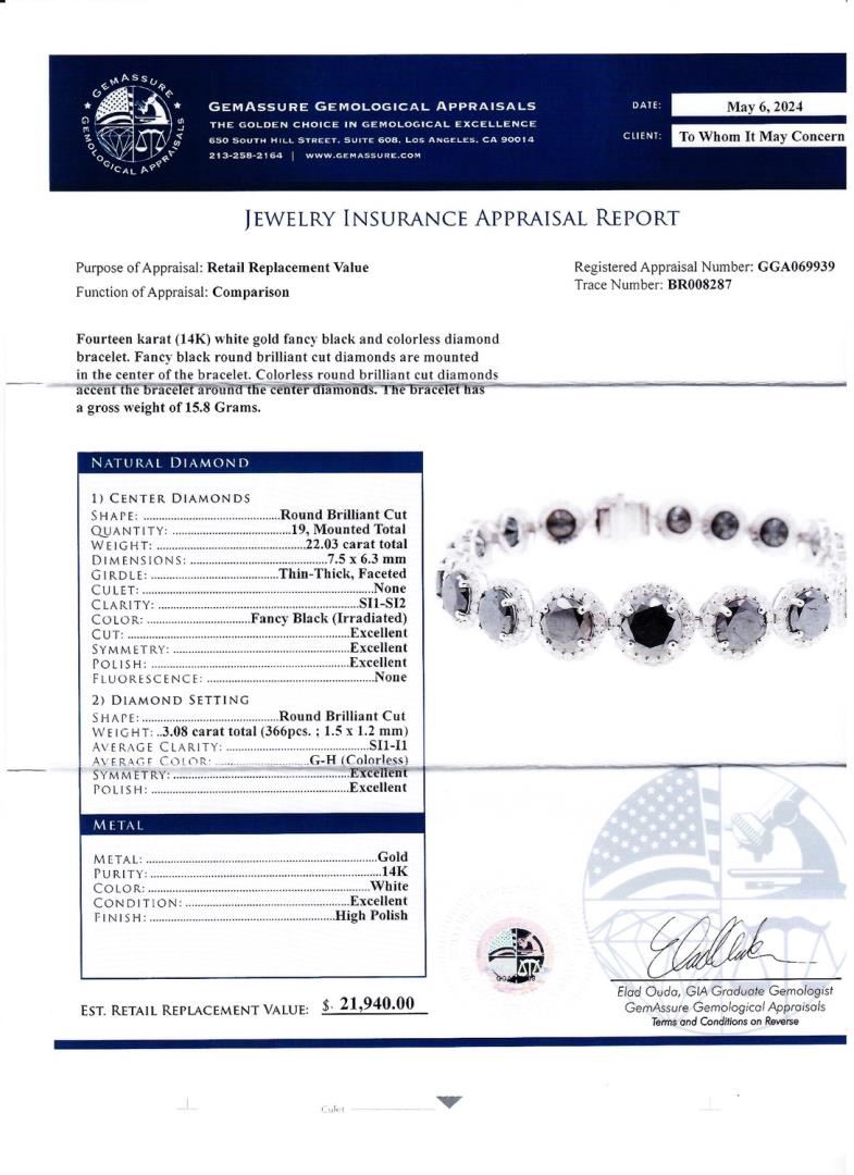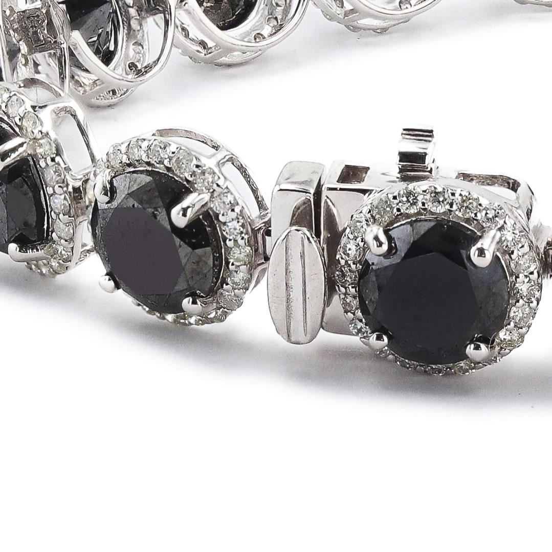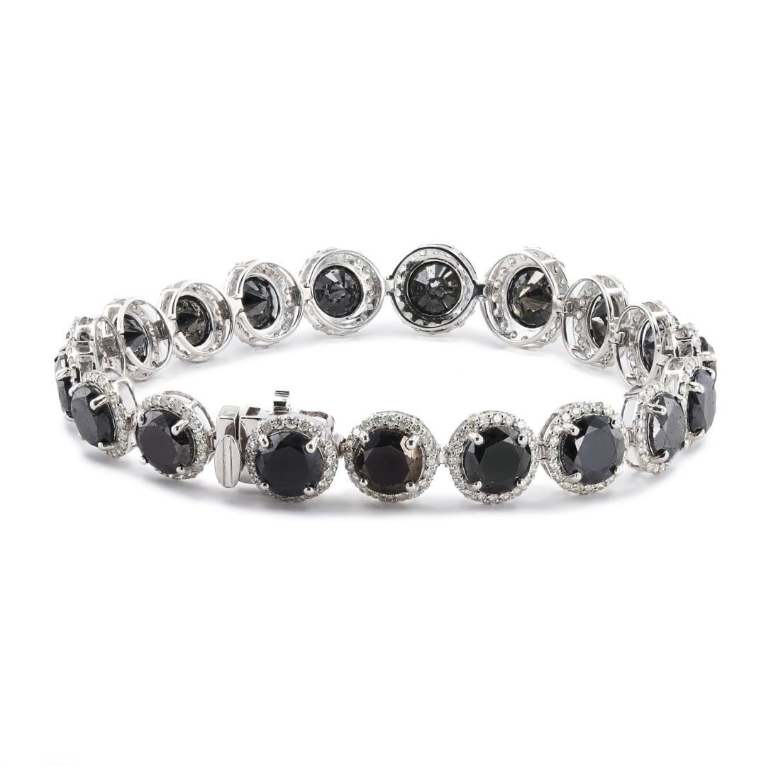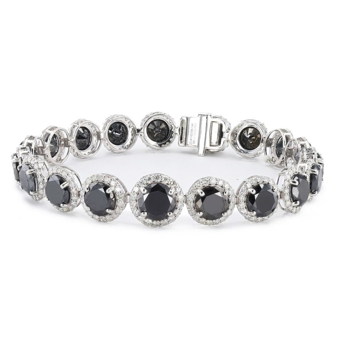 Fourteen karat (14K) white gold fancy black and colorless diamond bracelet. Fancy black round brilliant cut diamonds are mounted in the center of the bracelet. Colorless round brilliant cut diamonds accent the bracelet around the center diamonds. The brac