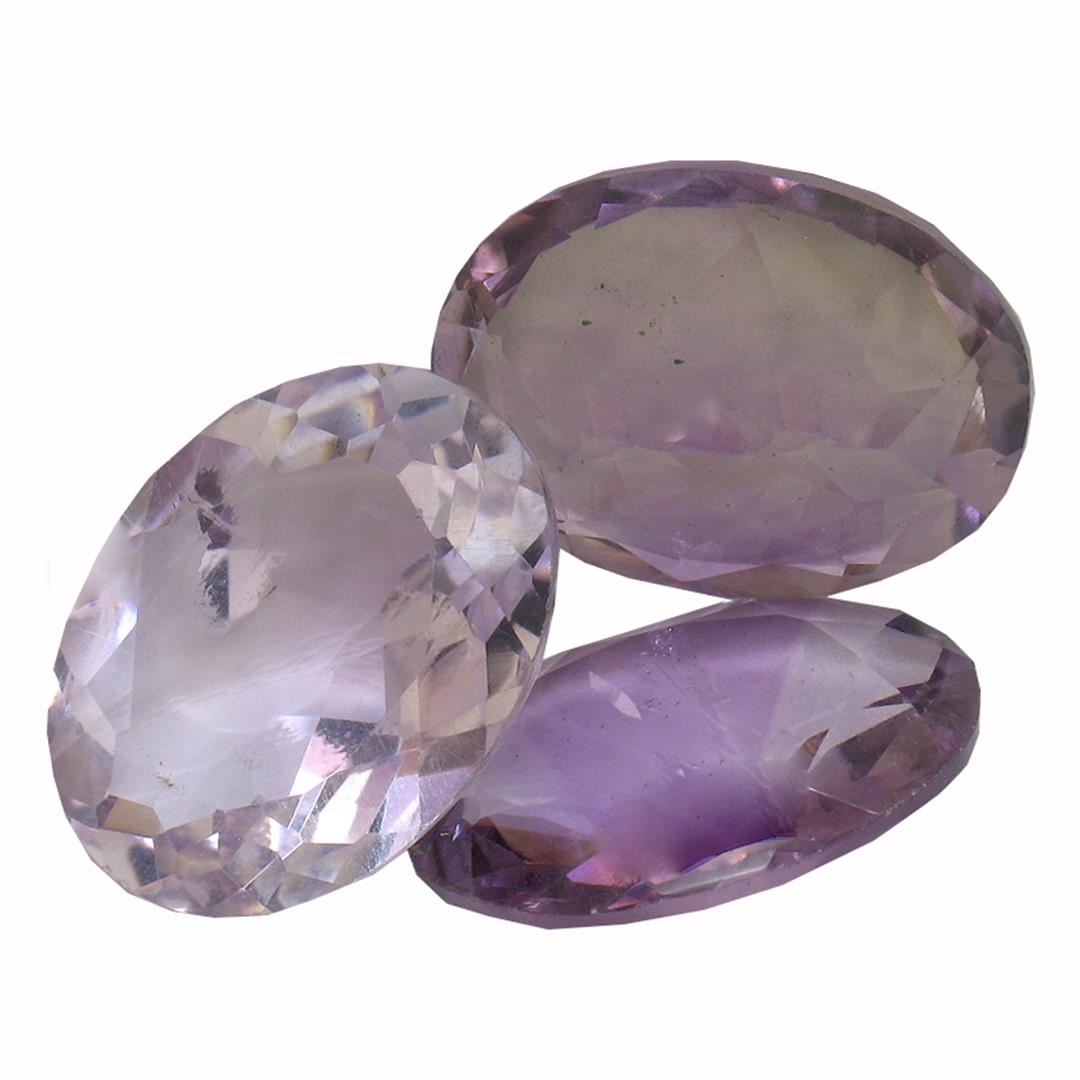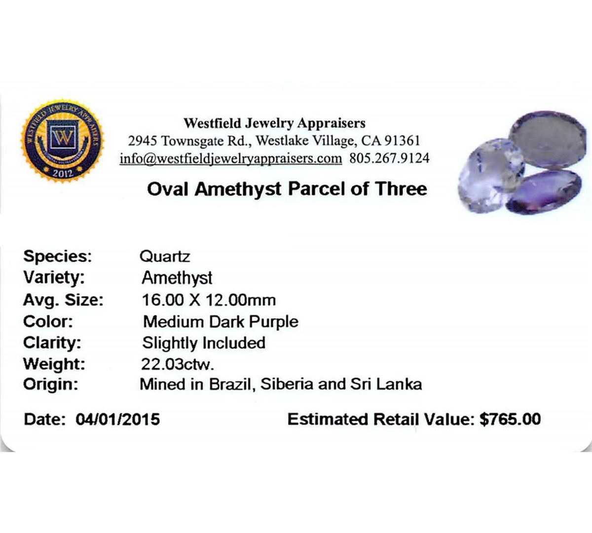 Three oval mixed cut natural amethysts exact total weight 22.03ct., clarity is slightly included, type II, medium dark, very slightly grayish, purple color, (GIA P 6/3), cut is good. Westfield Appraised at $765.00.