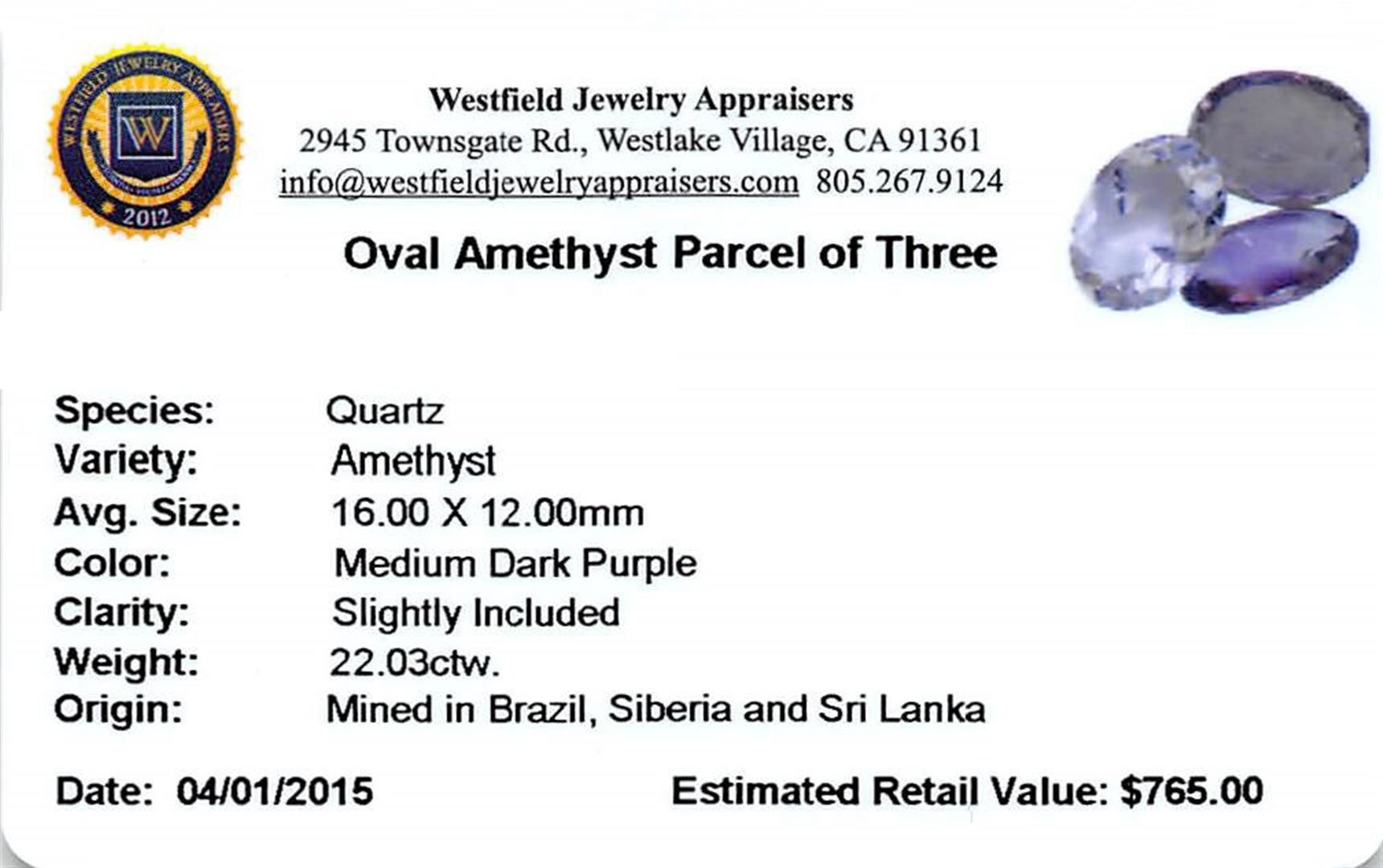 Three oval mixed cut natural amethysts exact total weight 22.03ct., clarity is slightly included, type II, medium dark, very slightly grayish, purple color, (GIA P 6/3), cut is good. Westfield Appraised at $765.00.