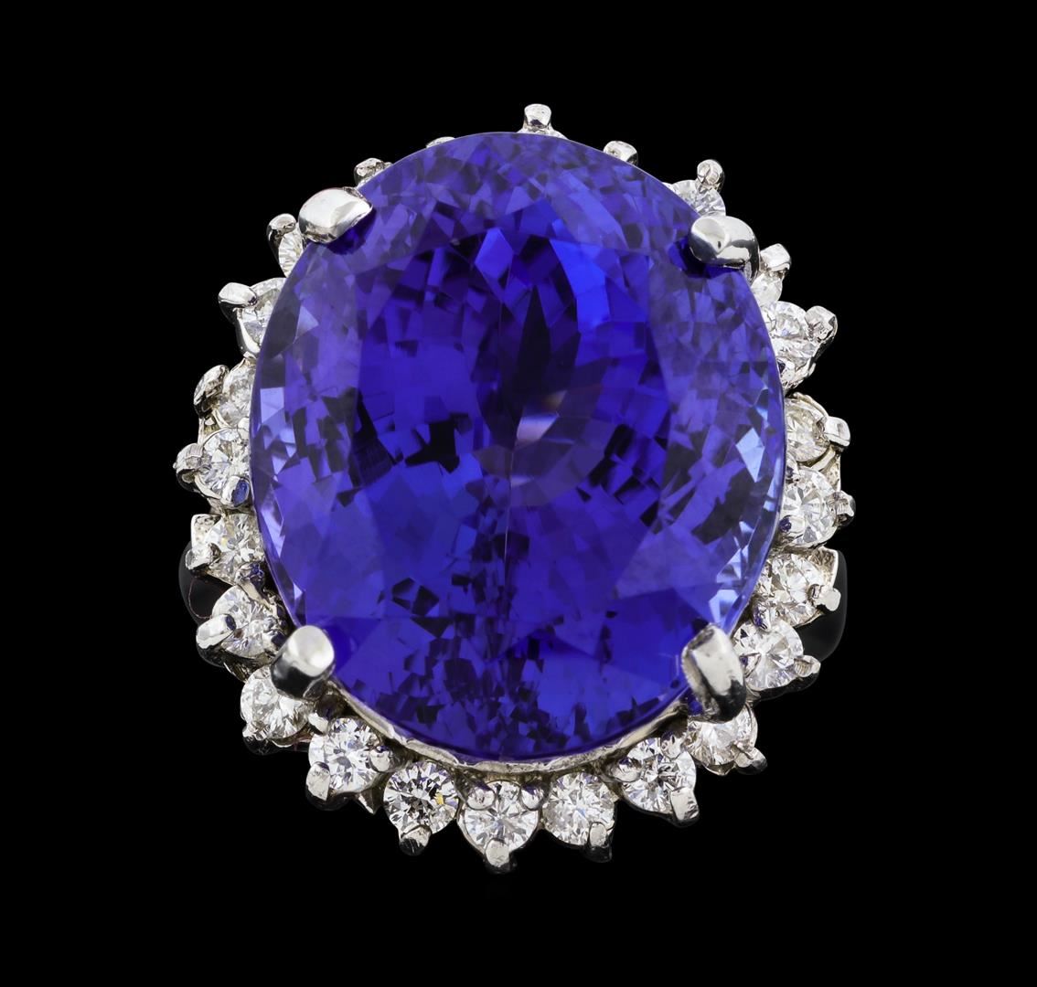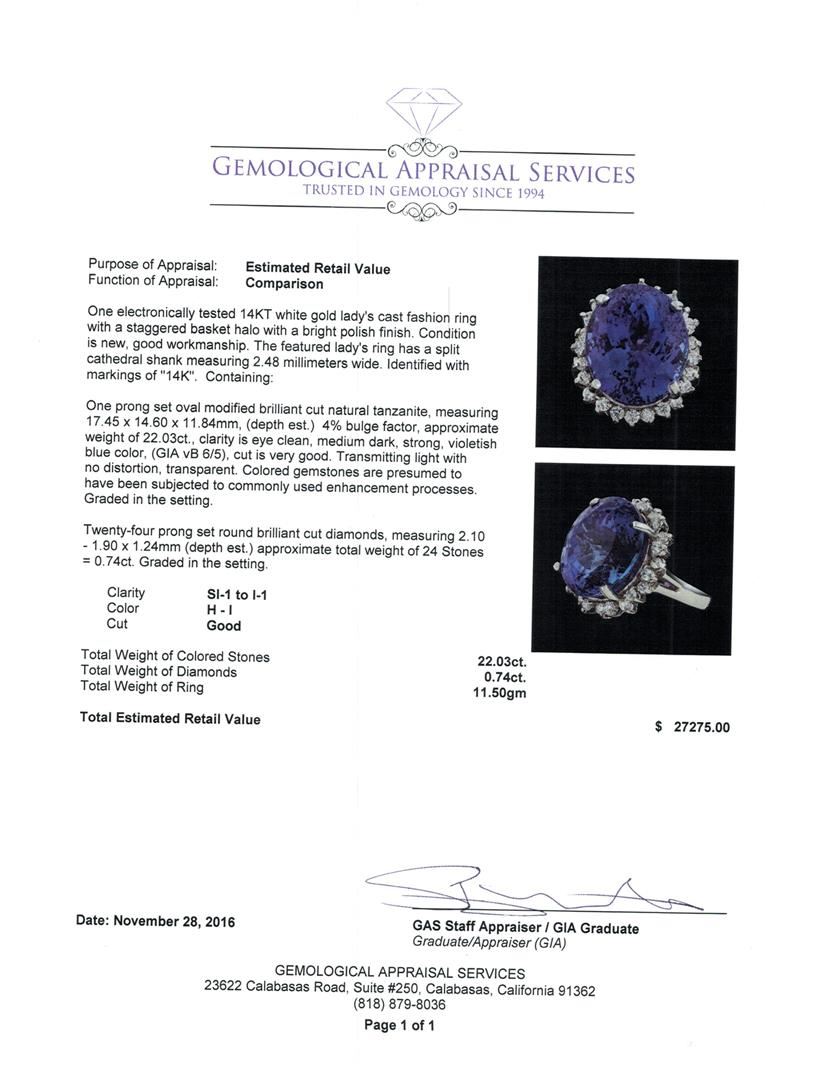 One electronically tested 14KT white gold lady's cast fashion ring with a staggered basket halo with a bright polish finish. The featured lady's ring has a split cathedral shank measuring 2.48 millimeters wide. Identified with markings of '14K'. Condition is new, good workmanship. Containing: One prong set oval modified brilliant cut natural tanzanite, measuring 17.45 x 14.60 x 11.84mm, (depth est.) 4%. bulge factor, approximate weight of 22.03ct., clarity is eye clean, medium dark, strong, violetish blue color, (GIA vB 6/5), cut is very good. Transmitting light with no distortion, transparent. Colored gemstones are presumed to have been subjected to commonly used enhancement processes. Graded in the setting. Twenty-Four prong set round brilliant cut diamonds, measuring 2.10 - 1.90 x 1.24mm (depth est.) approximate total weight of 24 Stones = 0.74ct. Graded in the setting. Clarity SI-1 to I-1. Color: H - I Cut Good. Total Weight of Colored Stones 22.03ct.. Total Weight of Diamonds 0.74ct.. Total Weight of Ring 11.50gm. GAS Appraised at $27,275.00.