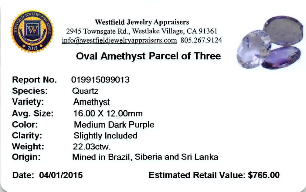 Three oval mixed cut natural amethysts exact total weight 22.03ct., clarity is slightly included, type II, medium dark, very slightly grayish, purple color, (GIA P 6/3), cut is good. Westfield Appraised at $765.00.