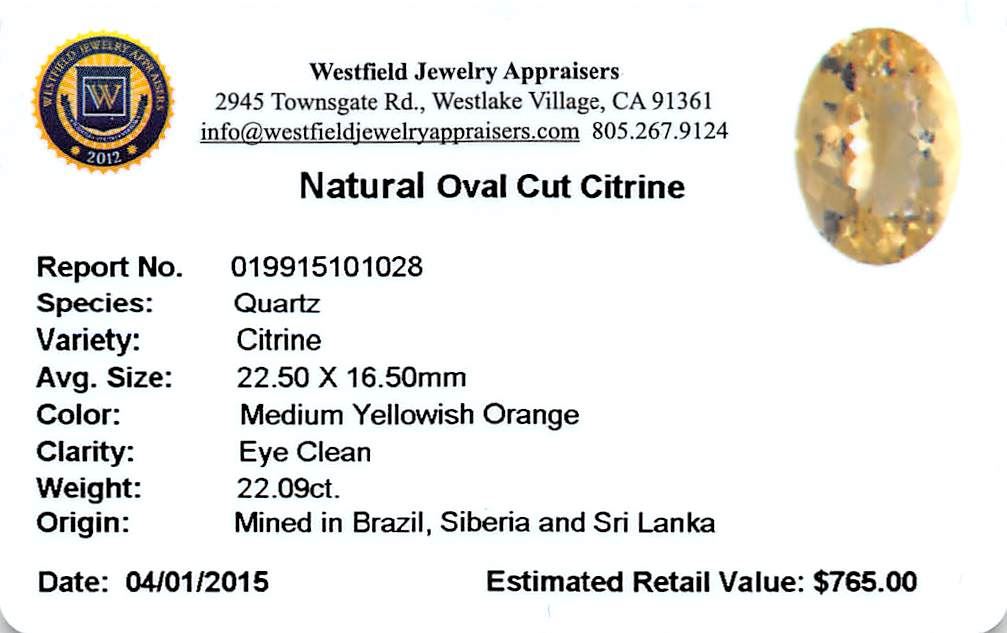 One oval cut natural citrine quartz exact weight 22.09ct., clarity is eye clean, type I, medium, slightly brownish, yellowish orange color, (GIA yO 5/2), cut is good. Westfield Appraised at $765.00.