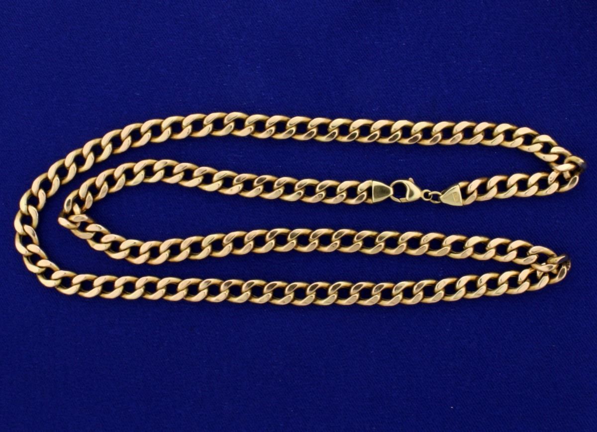 In 14k rose gold, 6.3 mm wide, with a lobster clasp. 23.8g