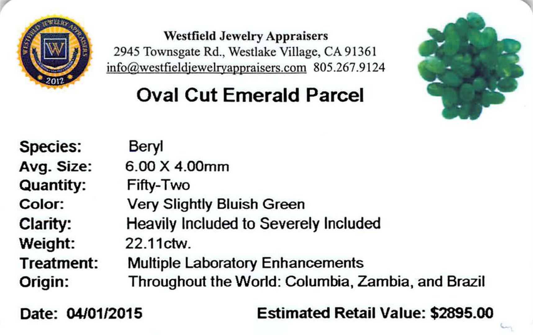 Fifty-two oval mixed cut natural emeralds exact total weight 22.11ct., clarity is heavily included, type III, medium dark, very slightly grayish, very slightly bluish green color, (GIA vslbG 6/3), cut is good. Westfield Appraised at $2,895.00.