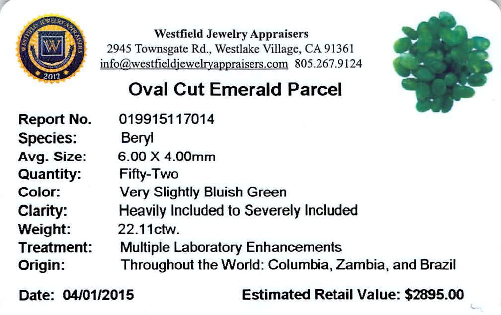 Fifty-two oval mixed cut natural emeralds exact total weight 22.11ct., clarity is heavily included, type III, medium dark, very slightly grayish, very slightly bluish green color, (GIA vslbG 6/3), cut is good. Westfield Appraised at $2,895.00.