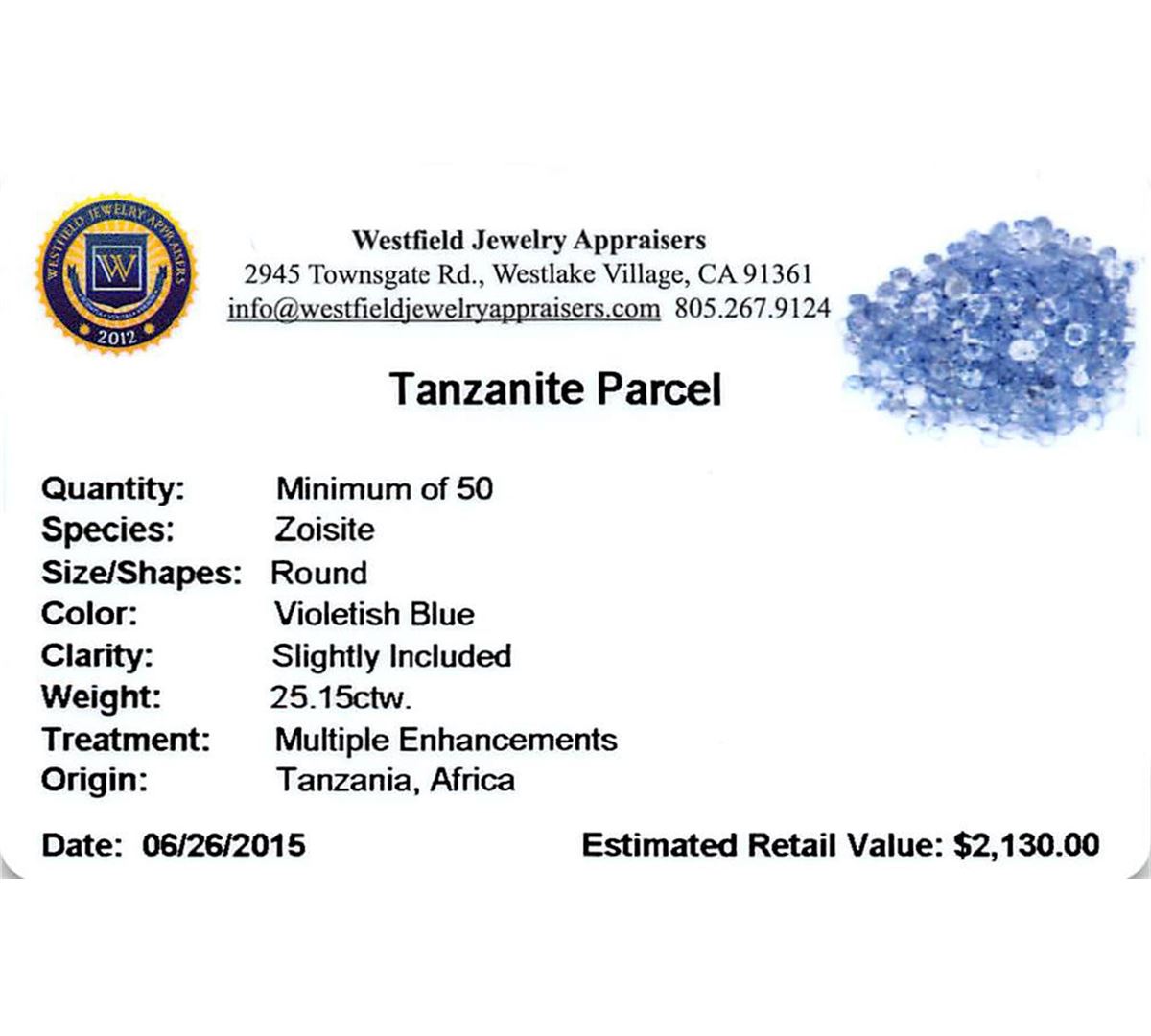 Fifty round mixed cut natural tanzanites, measuring 2.00 - 2.00 x 1.30 mm, exact total weight 22.15ct., clarity is slightly included, type I, medium light, very slightly grayish, violetish blue color, (GIA vB 4/3), cut is good. Measurements & the color grade are an average for the group, Color grade is an average for the group, Transmitting light with no distortion, transparent, Naturally occurring internal & external characteristics are present, Indications of multiple laboratory enhancements, including high temperature heat treatment. Westfield Appraised at $2,130.00.