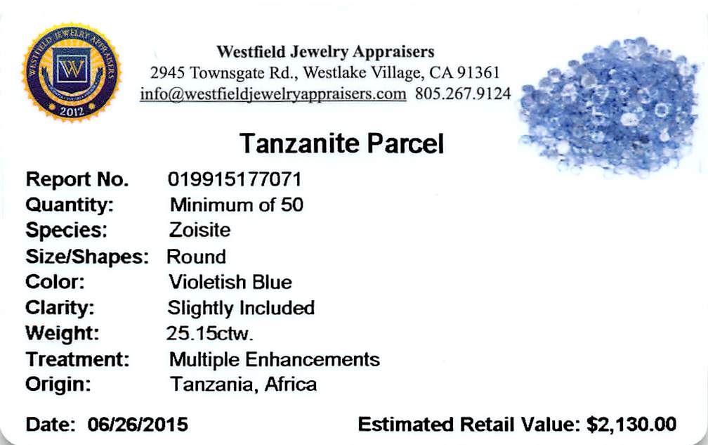 Fifty round mixed cut natural tanzanites, measuring 2.00 - 2.00 x 1.30 mm, exact total weight 22.15ct., clarity is slightly included, type I, medium light, very slightly grayish, violetish blue color, (GIA vB 4/3), cut is good. Measurements & the color grade are an average for the group, Color grade is an average for the group, Transmitting light with no distortion, transparent, Naturally occurring internal & external characteristics are present, Indications of multiple laboratory enhancements, including high temperature heat treatment. Westfield Appraised at $2,130.00.