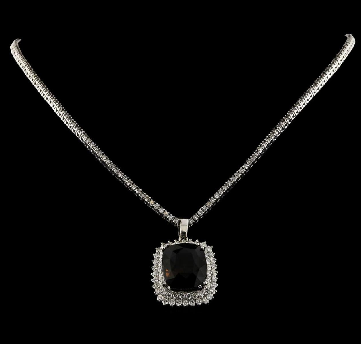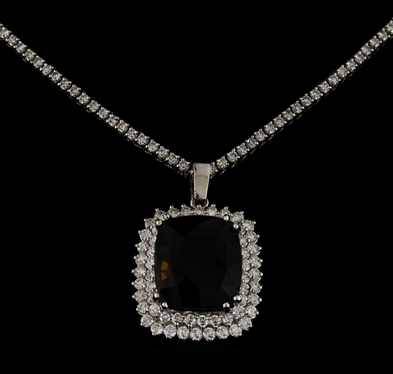 One 14KT White Gold Pendant with Diamond Necklace Included, 16 Inches, 33.06 grams. Containing: Main Gemstones: Identity: Natural Bi-Color Tourmaline. Carat Weight: 22.17 cts tw. Shape & Measurement: Cushion Shape 17.4 x 15.45. Quality: Very rare gem color. Cognac/Champagne Color. Fine Cutting. Adjacent Gemstones: Identity: Natural Diamond. Shape: Round Cut. Carat Weight: 6.16 cts tw. Quality: VS-SI Clarity, G-H Color. All fine cutting and proportions. Total gemstones weight: 28.33 cts tw. RBGS Appraised at $36,000.00.