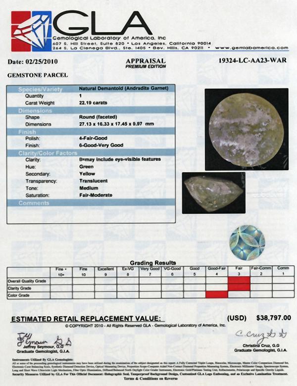 Huge green specimen round cut with horsetail inclusions; lab quality evaluation 4; no treatment noted; Gem Guide wholesale $6657-$22190; full retail appraisal $38797; full lab evaluation included