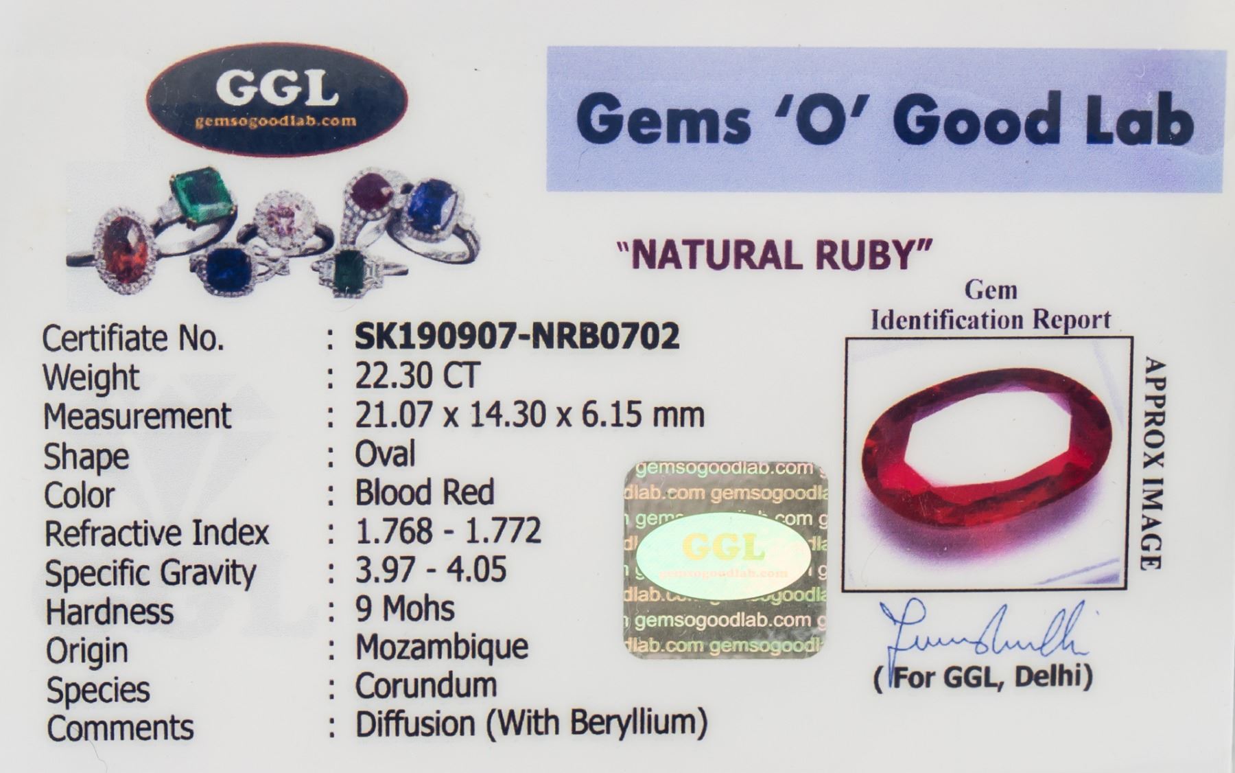 One (1) 22.30 ct oval cut blood red ruby gemstone. 21.07 x 14.30 x 6.15 mm. Accompanied with GGL certificate.