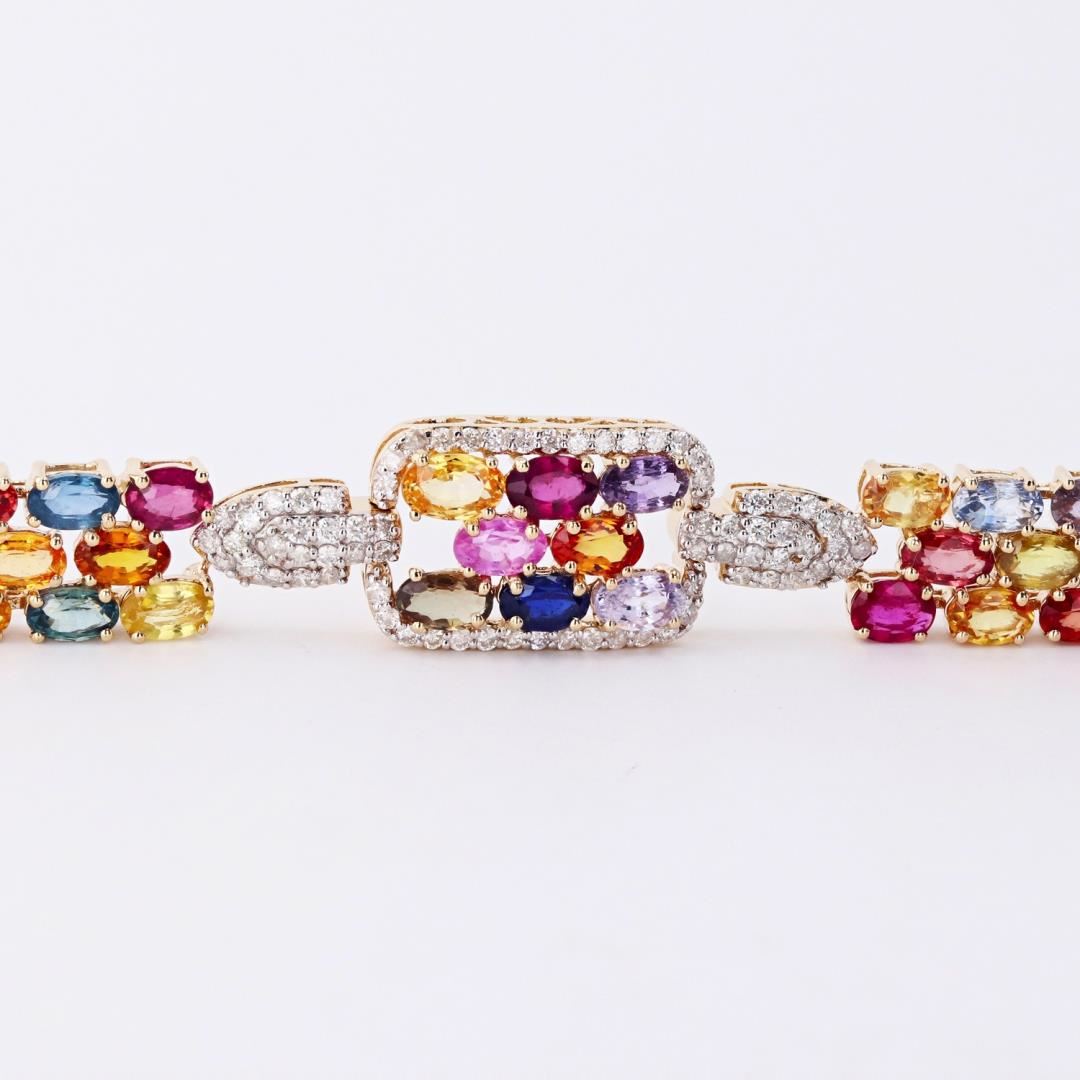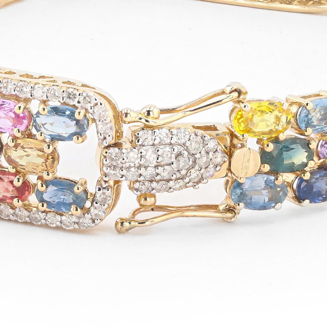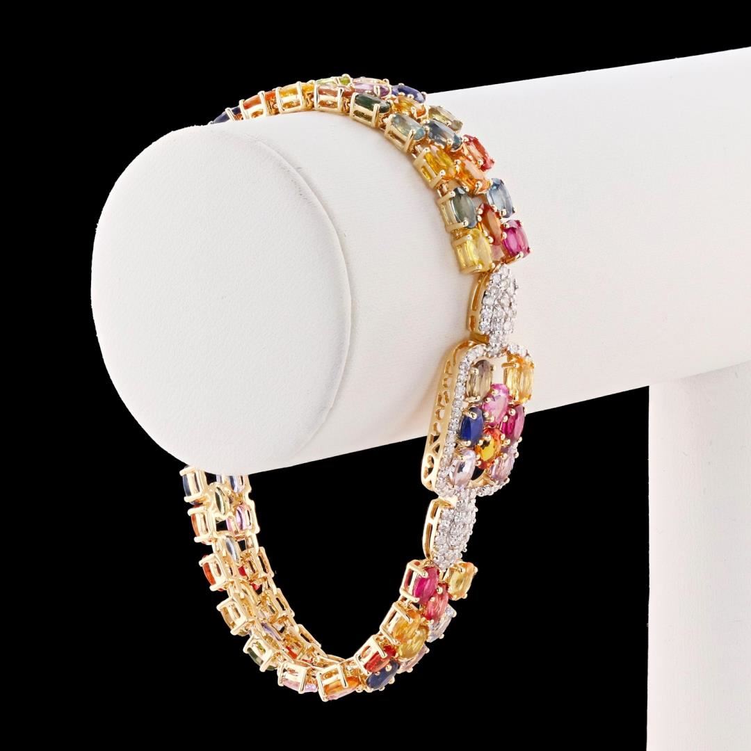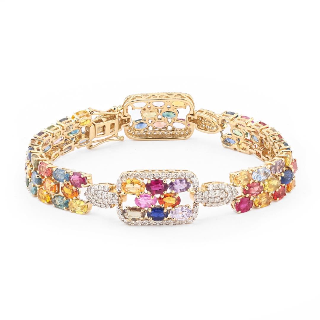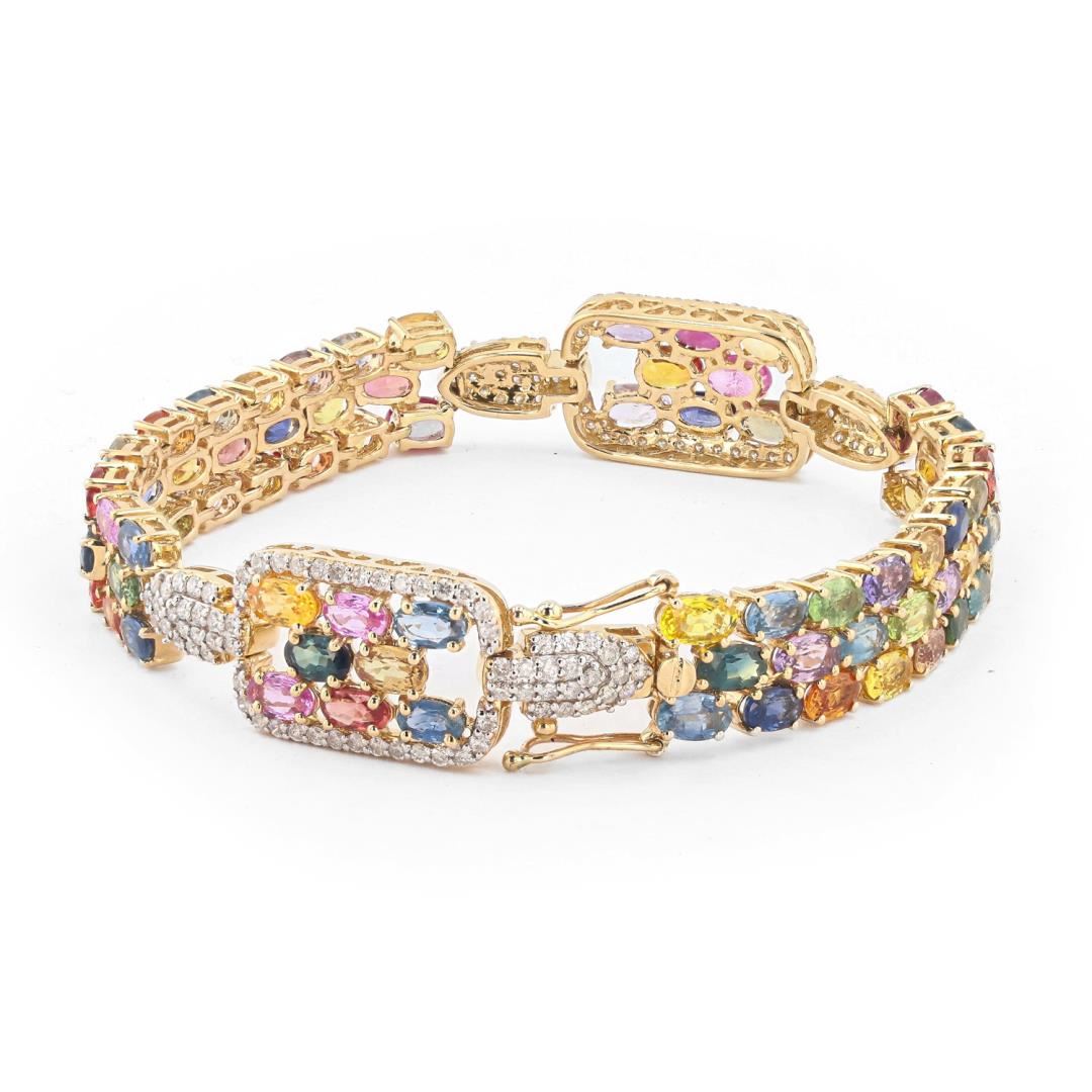 Fourteen karat (14K) yellow gold natural multi color sapphire corundum and diamond bracelet. Seventy four (74) oval cut natural multi color sapphire corundum gemstones are mounted in the center of the bracelet. Round brilliant cut diamonds accent the bracelet on both sides of the center gemstones. The bracelet has a gross weight of 20.5 Grams. #NATURAL GEMSTONE# GEMSTONE: Sapphire Corundum NATURE: Natural SHAPE: Oval Brilliant, Faceted Cut WEIGHT: 22.32 carat total (74pcs.) DIMENSIONS: 5.0 x 3.0mm CLARITY: Type 3 COLOR: Multi Color (5/5) SYMMETRY: Excellent COLOR INTENSITY: Intense TRANSPARENCY: Transparent TONE: Dark #NATURAL DIAMOND# SHAPE: Round Brilliant Cut WEIGHT: 1.46 carat total (144pcs.) DIMENSIONS: 1.3 x 1.2mm AVERAGE CLARITY: SI1-SI2 AVERAGE COLOR: G-H SYMMETRY: Excellent POLISH: Excellent #METAL# METAL: Gold PURITY: 14K COLOR: Yellow CONDITION: Excellent FINISH: High Polish
