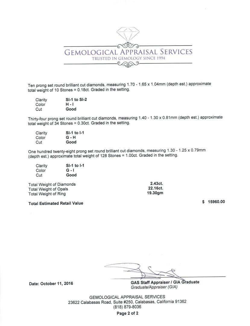 One electronically tested 14KT rose gold lady's cast fashion ring with a scalloped basket halo with a bright polish finish. The featured lady's ring has a shank measuring 4.12 millimeters wide. Identified with markings of 'K14'. Condition is new, good workmanship. Containing: One crystal opal that is cut in a oval shaped cabochon and is prong set, measuring 23.20 mm long x 16.50 mm wide, and 13.20 mm thick and the approximate weight is 22.16 carats. The opal has a bright, orange-green play of color (fire) in a rolling flashfire pattern; a medium dome; a good cut; no inclusions; consistent in its brightness and pattern; and is not directional. Graded in the setting. Two prong set round brilliant cut diamonds, measuring 3.00 - 2.95 x 1.85mm (depth est.) approximate total weight of 2 Stones = 0.20ct. Graded in the setting. Clarity SI-2 to I-1. Color: G - H Cut Good Ten prong set round brilliant cut diamonds, measuring 2.50 - 2.45 x 1.54mm (depth est.) approximate total weight of 10 Stones = 0.58ct. Graded in the setting. Clarity SI-1 to SI-2. Color: H - I Cut Good Four prong set round brilliant cut diamonds, measuring 2.20 - 2.15 x 1.35mm (depth est.) approximate total weight of 4 Stones = 0.17ct. Graded in the setting. Clarity SI-1 to SI-2. Color: H - I Cut Good Ten prong set round brilliant cut diamonds, measuring 1.70 - 1.65 x 1.04mm (depth est.) approximate total weight of 10 Stones = 0.18ct. Graded in the setting. Clarity SI-1 to SI-2. Color: H - I Cut Good Thirty-Four prong set round brilliant cut diamonds, measuring 1.40 - 1.30 x 0.81mm (depth est.) approximate total weight of 34 Stones = 0.30ct. Graded in the setting. Clarity SI-1 to I-1. Color: G - H Cut Good One Hundred Twenty-Eight prong set round brilliant cut diamonds, measuring 1.30 - 1.25 x 0.79mm (depth est.) approximate total weight of 128 Stones = 1.00ct. Graded in the setting. Clarity SI-1 to I-1. Color: G - I Cut Good. Total Weight of Diamonds 2.43ct.. Total Weight of Opals 22.16ct.. Total Weight of Ring 19.30gm. GAS Appraised.