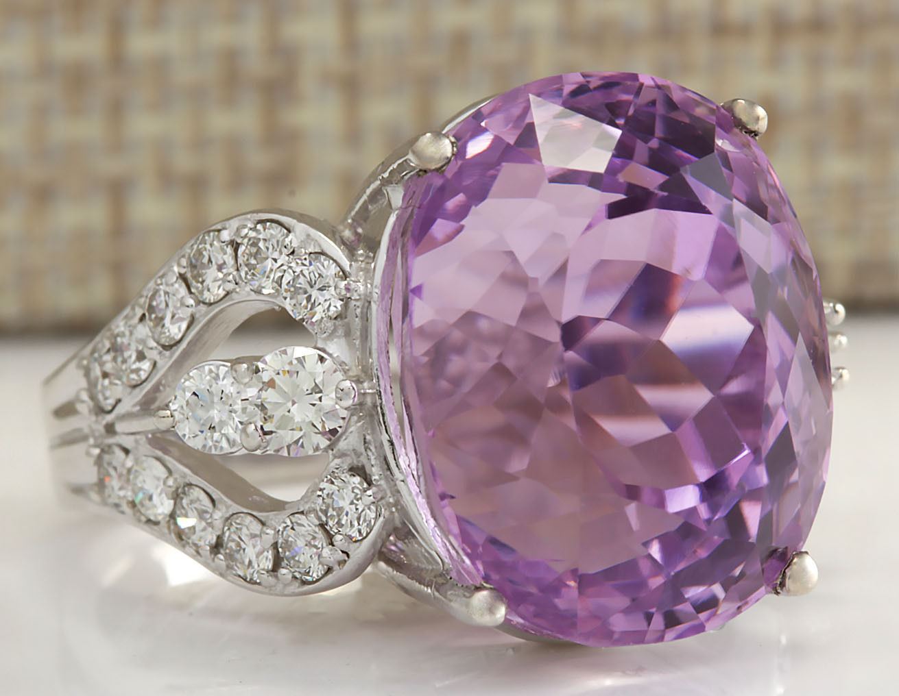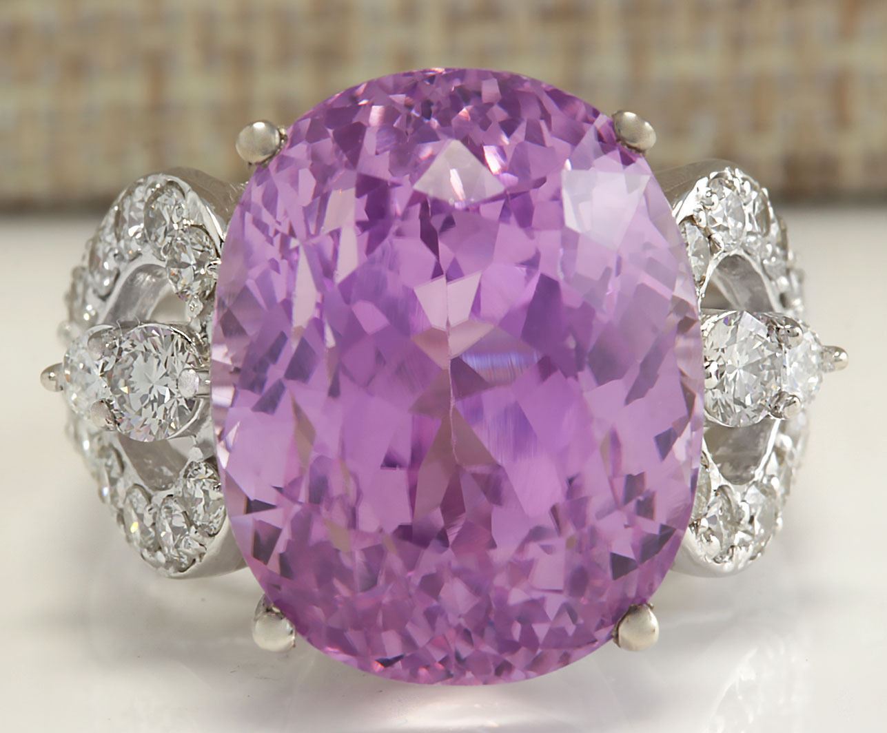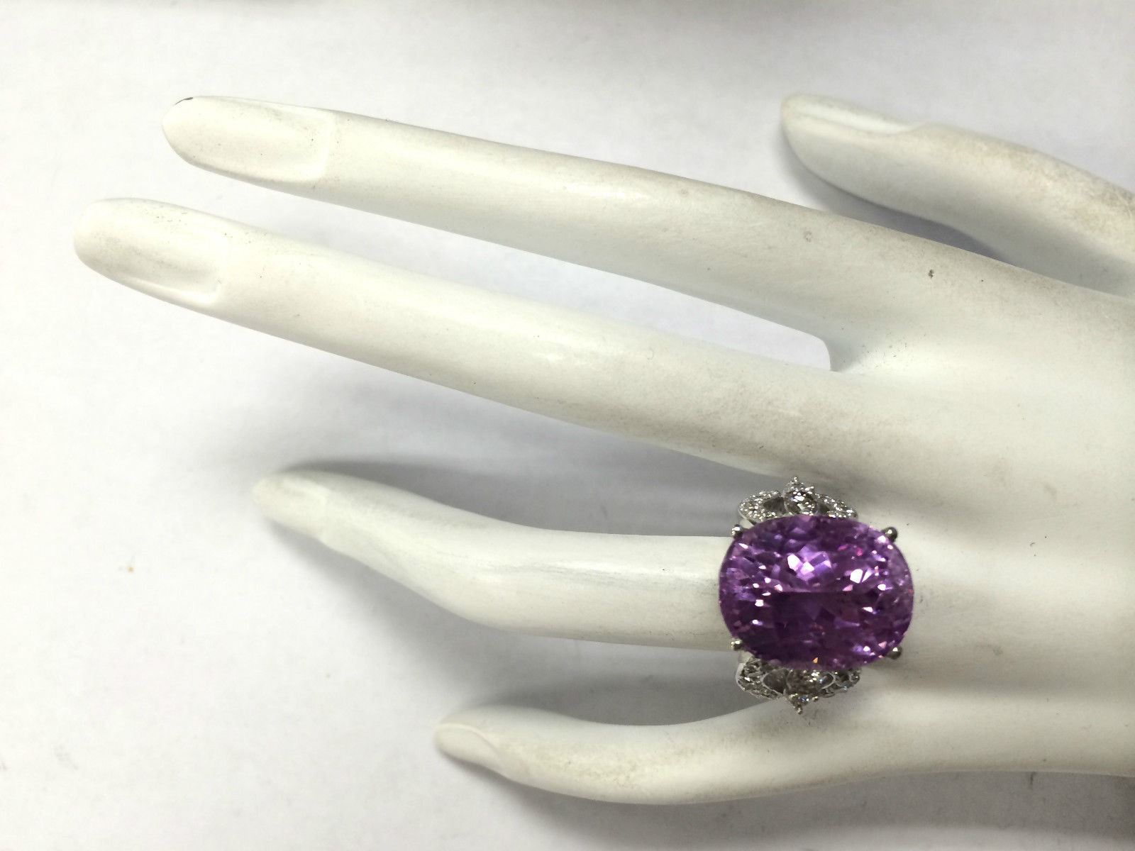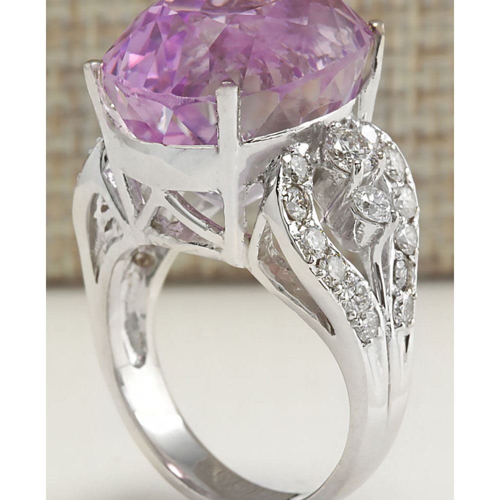 22.38 CTW Natural Kunzite And Diamond Ring In 18K Solid White Gold