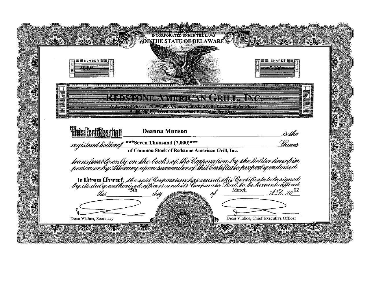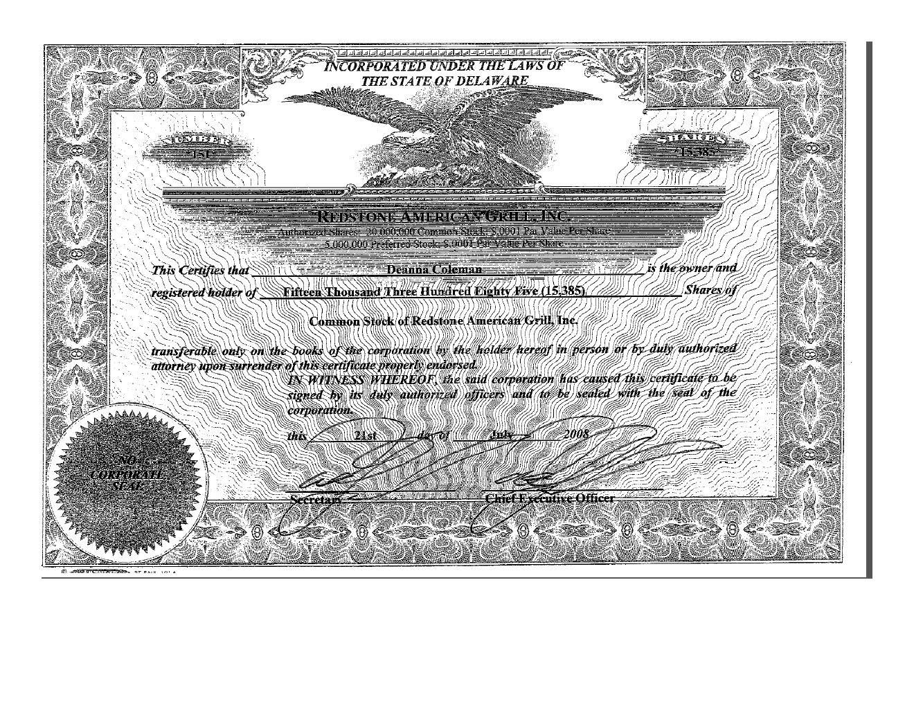 22,385 Shares of Stock in Redstone American Grill, Inc.; A Delaware Corporation