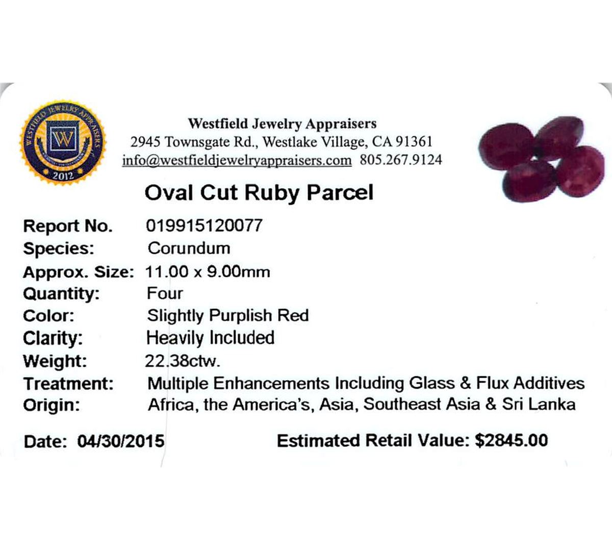 Four oval mixed cut natural rubies exact total weight 22.38ct., clarity is heavily included, type II, dark, very slightly brownish, slightly purplish red color, (GIA slpR 7/3), cut is good. Westfield Appraised at $2,845.00.