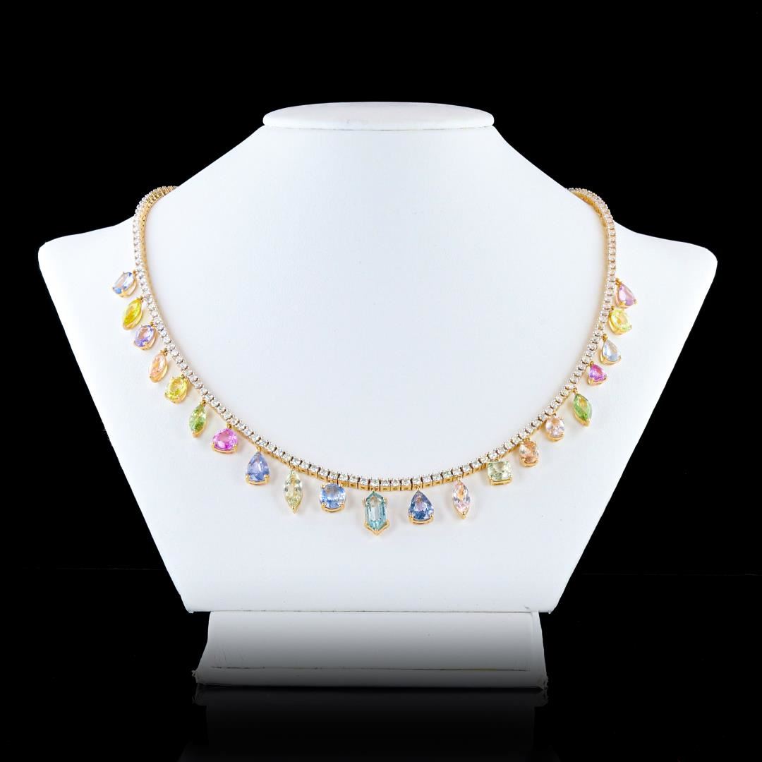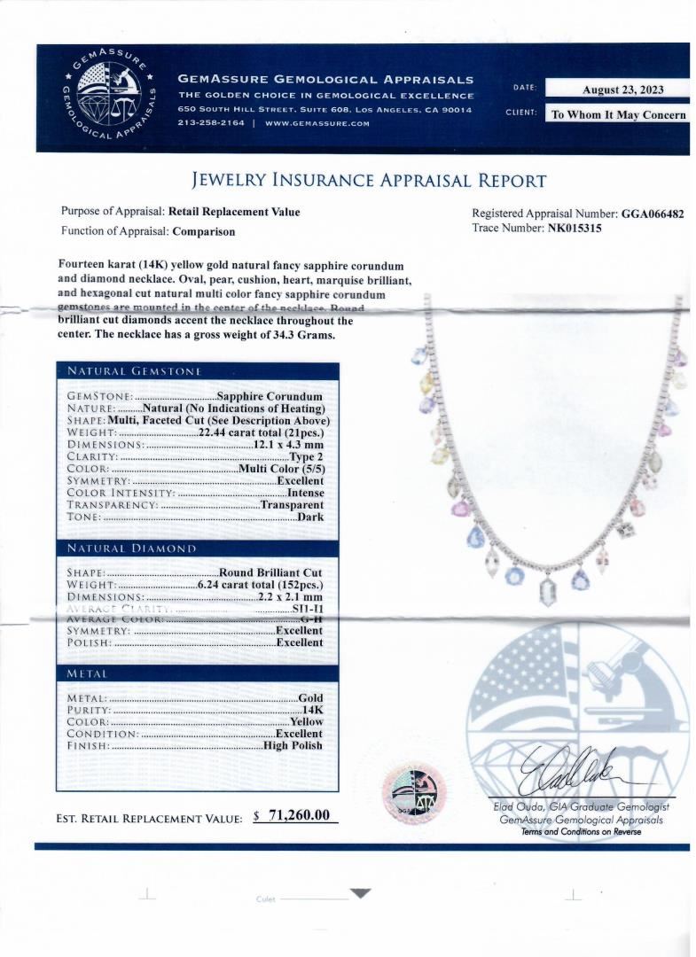 Fourteen karat (14K) yellow gold natural fancy sapphire corundum and diamond necklace. Oval, pear, cushion, heart, marquise brilliant, and hexagonal cut natural multi color fancy sapphire corundum brilliant cut diamonds accent the necklace throughout the center. The necklace has a gross weight of 34.3 Grams. #NATURAL GEMSTONE# GEMSTONE: Sapphire Corundum NATURE: Natural (No Indications of Heating) SHAPE: Multi, Faceted Cut (See Description Above) WEIGHT: 22.44 carat total (21pcs.) DIMENSIONS: 12.1 x 4.3mm CLARITY: Type 2 COLOR: Multi Color (5/5) SYMMETRY: Excellent COLOR INTENSITY: Intense TRANSPARENCY: Transparent TONE: Dark #NATURAL DIAMOND# SHAPE: Round Brilliant Cut WEIGHT: 6.24 carat total (152pcs.) DIMENSIONS: 2.2 x 2.1mm AVERAGE CLARITY: SI1-I1 AVERAGE COLOR: G-H SYMMETRY: Excellent POLISH: Excellent #METAL# METAL: Gold PURITY: 14K COLOR: Yellow CONDITION: Excellent FINISH: High Polish Size: 17