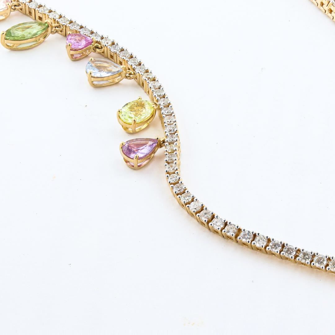 Fourteen karat (14K) yellow gold natural fancy sapphire corundum and diamond necklace. Oval, pear, cushion, heart, marquise brilliant, and hexagonal cut natural multi color fancy sapphire corundum brilliant cut diamonds accent the necklace throughout the center. The necklace has a gross weight of 34.3 Grams. #NATURAL GEMSTONE# GEMSTONE: Sapphire Corundum NATURE: Natural (No Indications of Heating) SHAPE: Multi, Faceted Cut (See Description Above) WEIGHT: 22.44 carat total (21pcs.) DIMENSIONS: 12.1 x 4.3mm CLARITY: Type 2 COLOR: Multi Color (5/5) SYMMETRY: Excellent COLOR INTENSITY: Intense TRANSPARENCY: Transparent TONE: Dark #NATURAL DIAMOND# SHAPE: Round Brilliant Cut WEIGHT: 6.24 carat total (152pcs.) DIMENSIONS: 2.2 x 2.1mm AVERAGE CLARITY: SI1-I1 AVERAGE COLOR: G-H SYMMETRY: Excellent POLISH: Excellent #METAL# METAL: Gold PURITY: 14K COLOR: Yellow CONDITION: Excellent FINISH: High Polish Size: 17